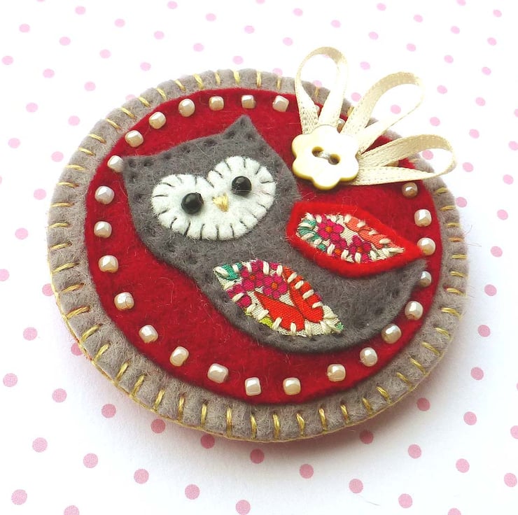 The brooch features a cute little owl in grey felt with applique details in lovely Liberty of London fabric. It has been mounted onto a dark red circular base which has been edged with cream seed beads. It has been further mounted onto grey felt and is finished with a flower button and ribbon detail. There is a metal brooch pin attached to the reverse side for easy attachment.