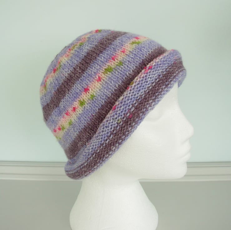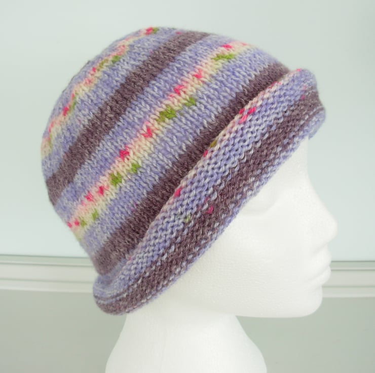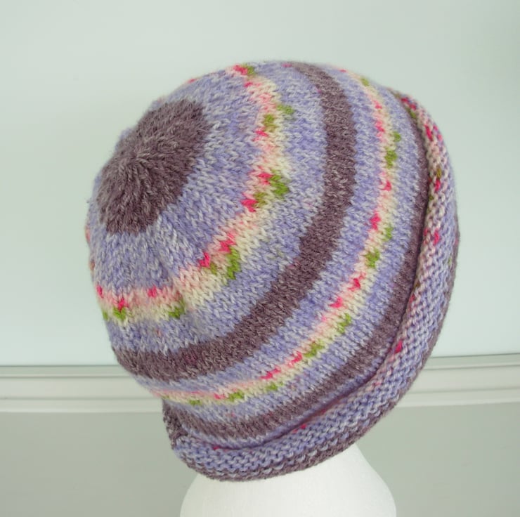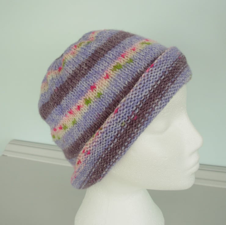 I've knitted this adults beanie hat in a double knit acrylic yarn that knits up in a Fairisle pattern.