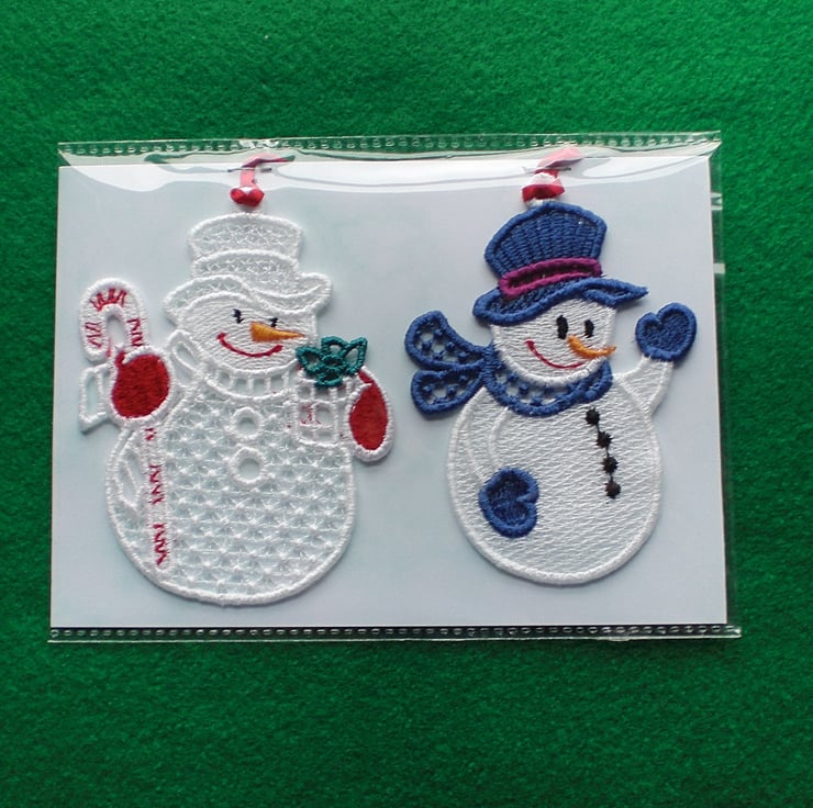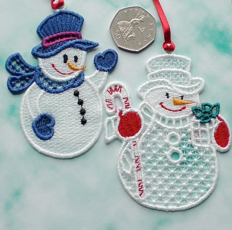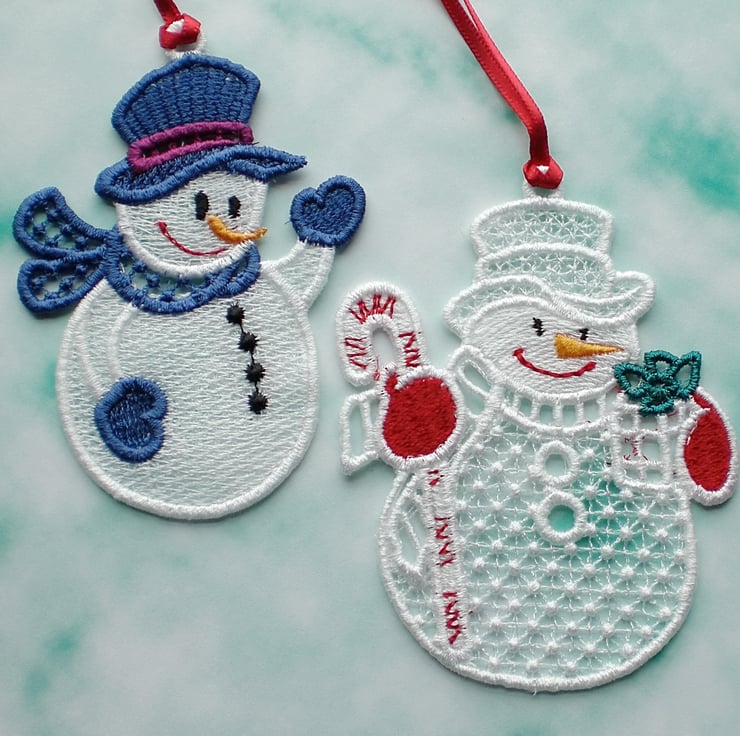2 embroidered lace snowmen to hang on your tree, or anywhere in your home.