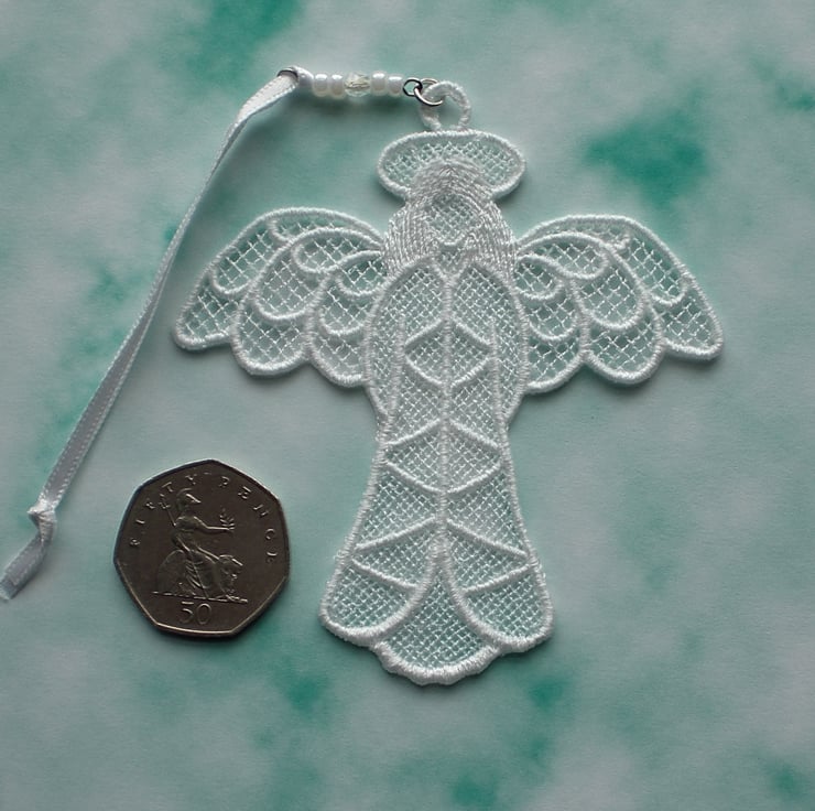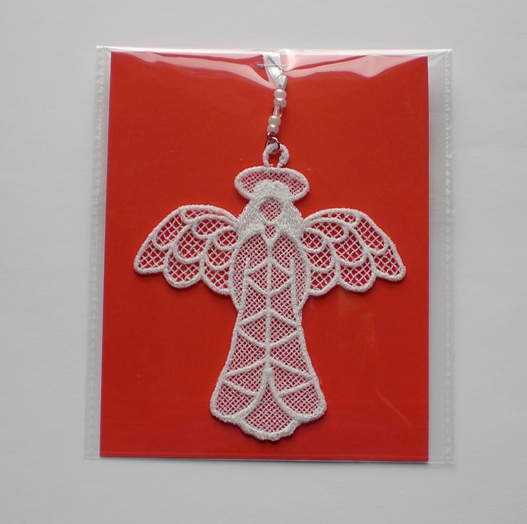 A lovely embroidered hanging angel in brilliant white embroidery thread. It hangs from a white satin ribbon, with beads and a crystal attached.