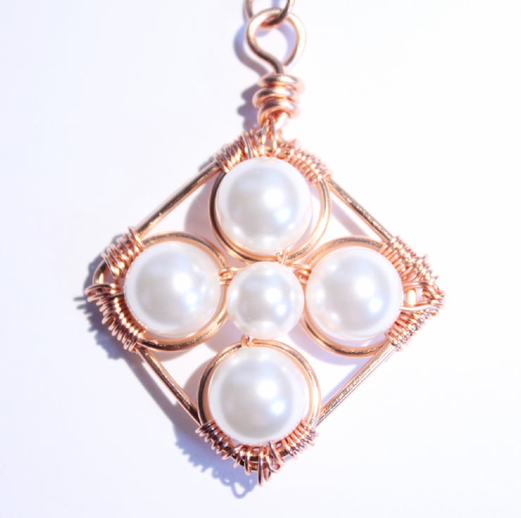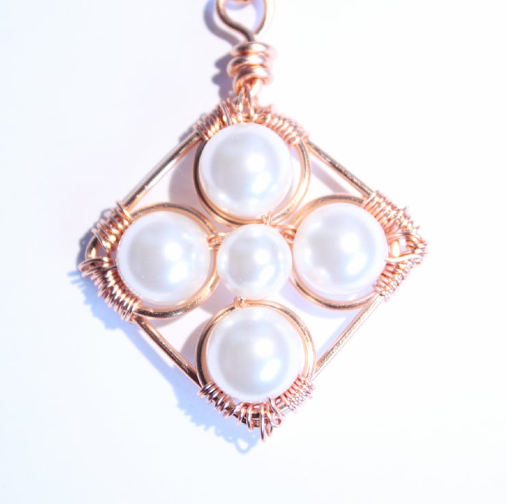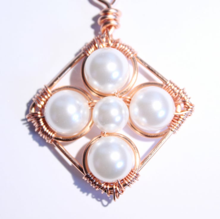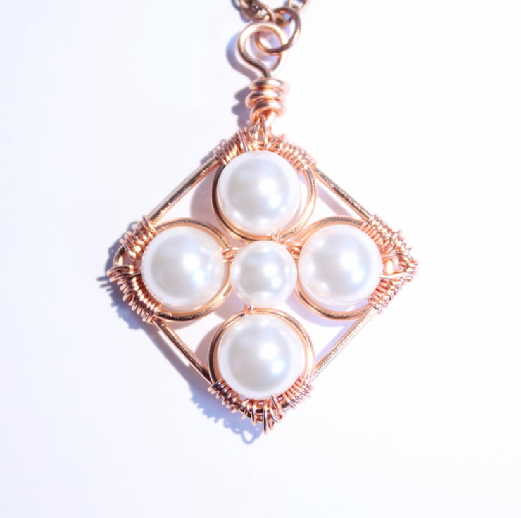 This lovely pendant is a square shape, framed in copper, with four 10 mm Swarovski crystal pearls at the four corners, and a 6 mm one in the centre. All the pearls are white. Each large pearl is secured in a copper jump ring. The large pearls and jump rings are wired to he frame at the corners, the small pearl is wired to two larger pearls and their jump rings.