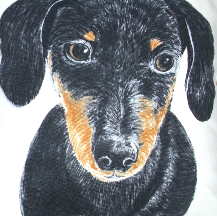 Portrait picture of a Black and tan Dachshund facing forward cushion, This is a 9.5 inch (24 cm) cushion.