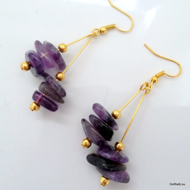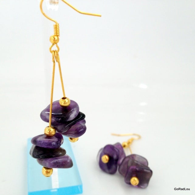 These earrings have been made by threading 2 gold plated beads with 3 genuine amethyst nuggets in between on to 2 gold plated headpins, a loop has then been made at the top of each headpin at different lengths to create a staggered effect. Both headpins are then attached to a gold plated ear wire giving the double stack look.