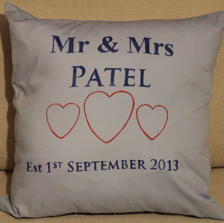 This cushion was designed for both a wedding gift and for a 2nd Anniversary cotton gift by adding "Est" at the beginning of the date. For an additional £5 "2nd Anniversary" or additional words can be added.