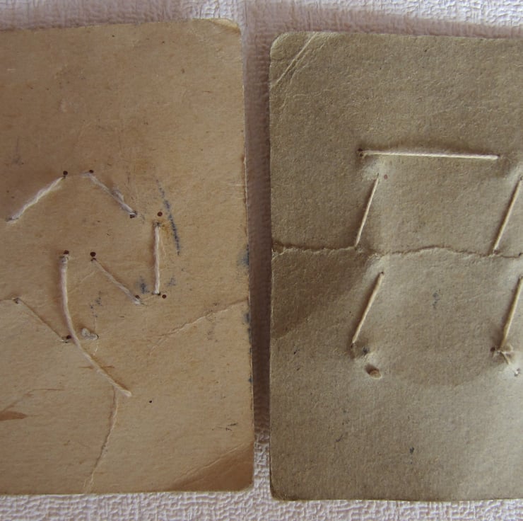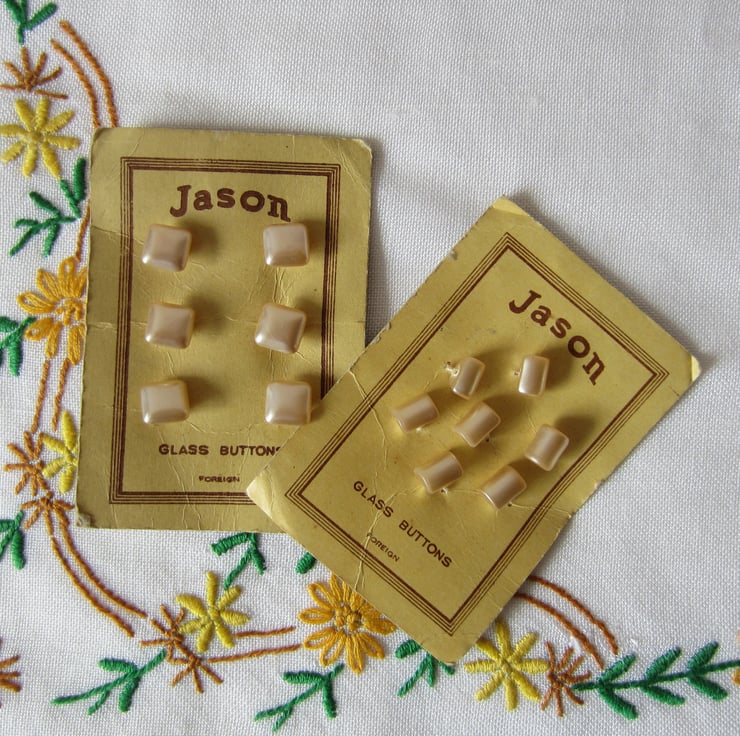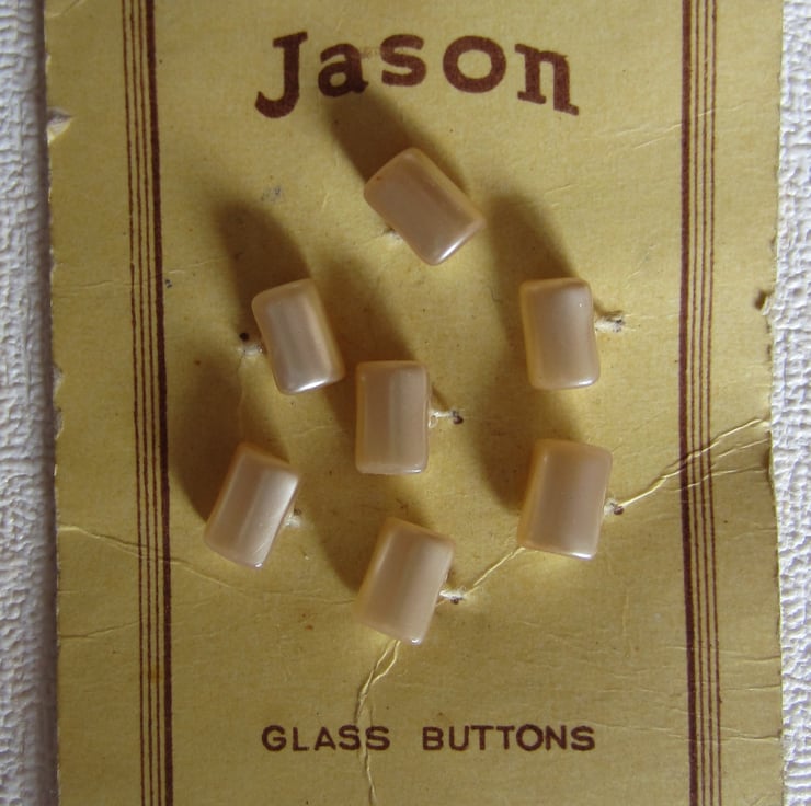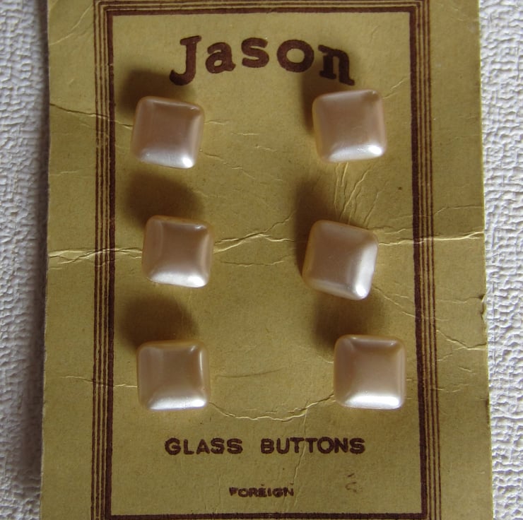 2 cards of vintage glass buttons by Jason. Pretty little buttons in a peachy ivory colour. The square buttons measure 1 x 1 cm and the others 9 x 7 mm.