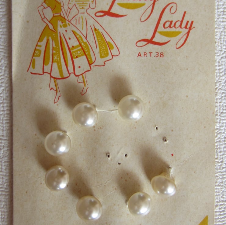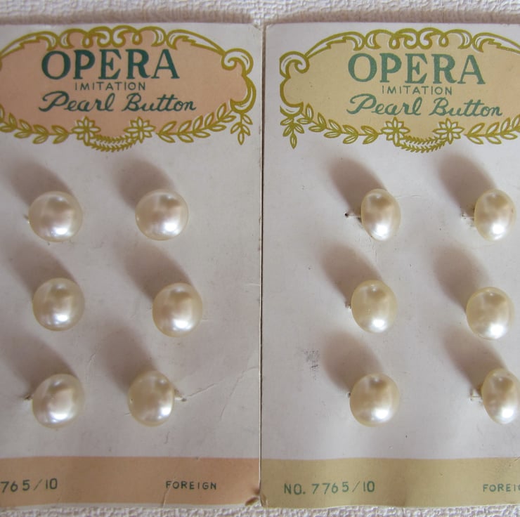 3 cards of vintage buttons. 2 cards of imitation pearl buttons by Opera and 1 card (not complete) of dainty glass buttons by Lucky Lady. 19 buttons in all. The larger buttons measure 1 cm across and the glass buttons 8 mm.