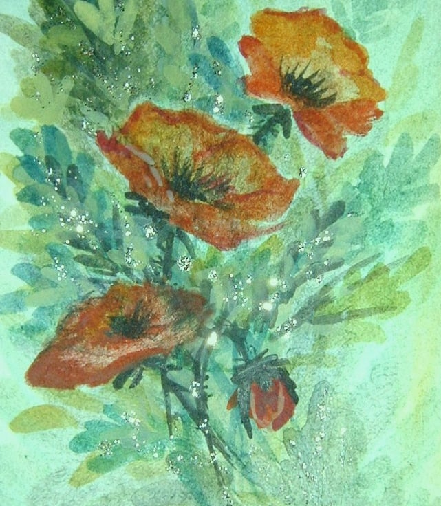 this tiny painting is of beautiful glitter poppies.....Hand painted and an original and NOT a print.