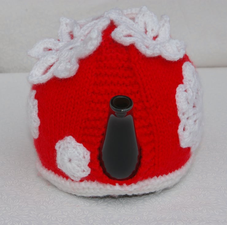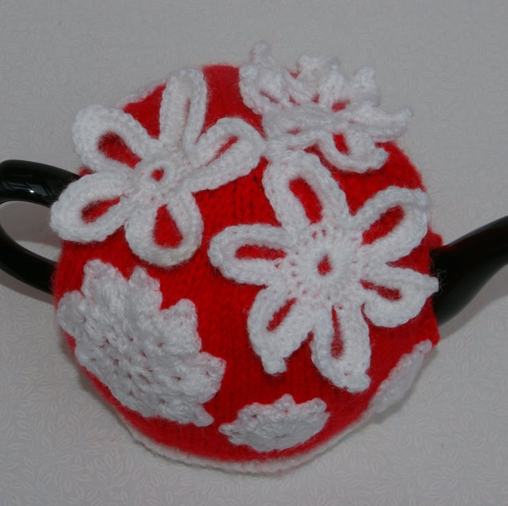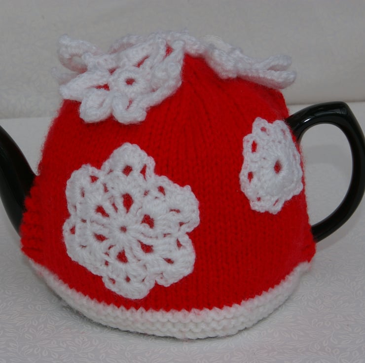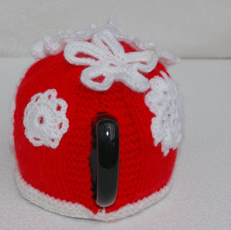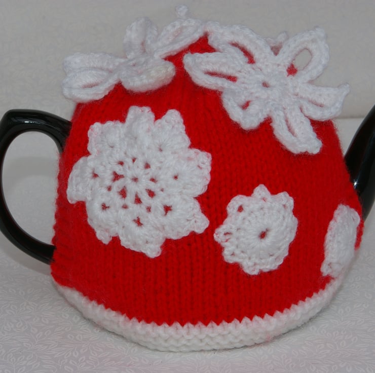 A red and white Christmas themed Teapot cosy hand knitted in Aran weight soft acrylic yarn. The tea cosy has been decorated with a series of white crochet snowflakes.
