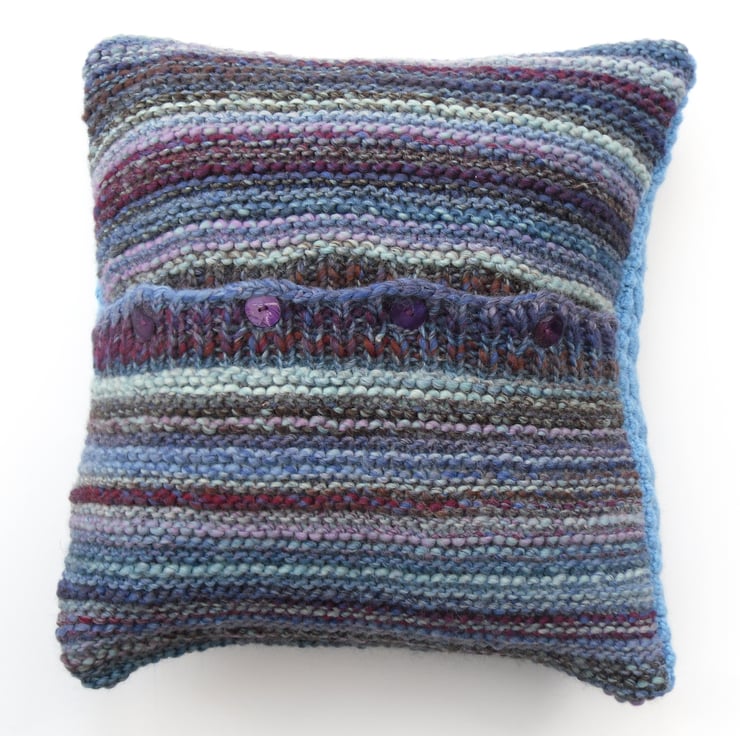 Blue Chunky cushion , made from a lovely combination of fabrics. One side is hand knitted using the glorious Italian Lana Grossa chunky colourful yarn (53% virgin wool, 47% acrylic). The other side is made from a recycled felted cabled 100% wool sweater in a glorious blue. It fastens with 4 shiny purple buttons