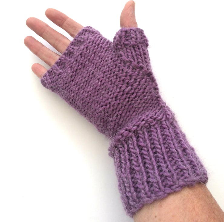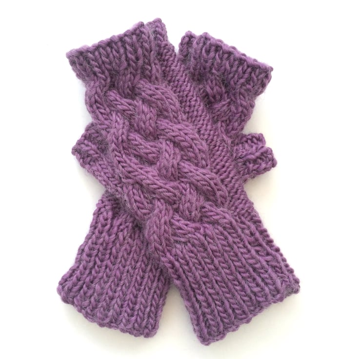 Lilac fingerless gloves , cable mitts , pretty and feminine yet chunky and warm.