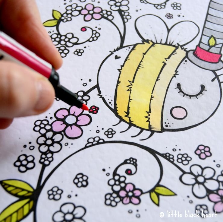 the linework is hand drawn, before being scanned in and then printed on a matt white textured card. it is then carefully coloured by hand, using a variety of coloured art pens.