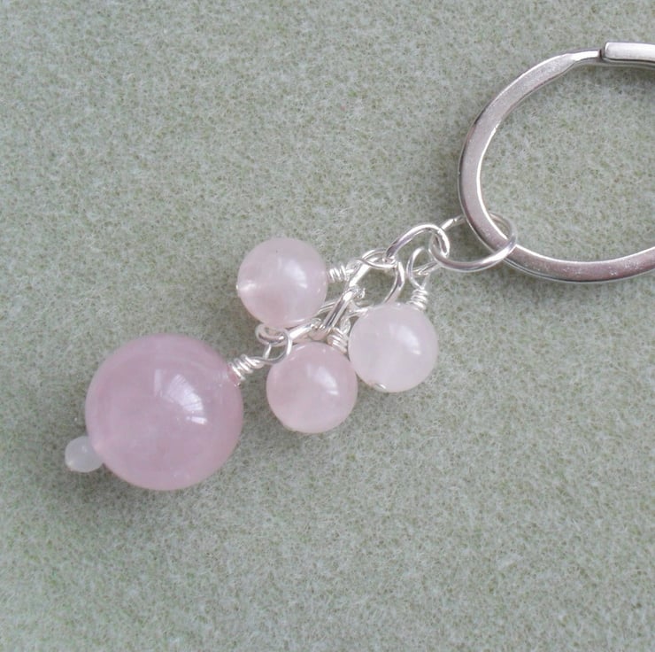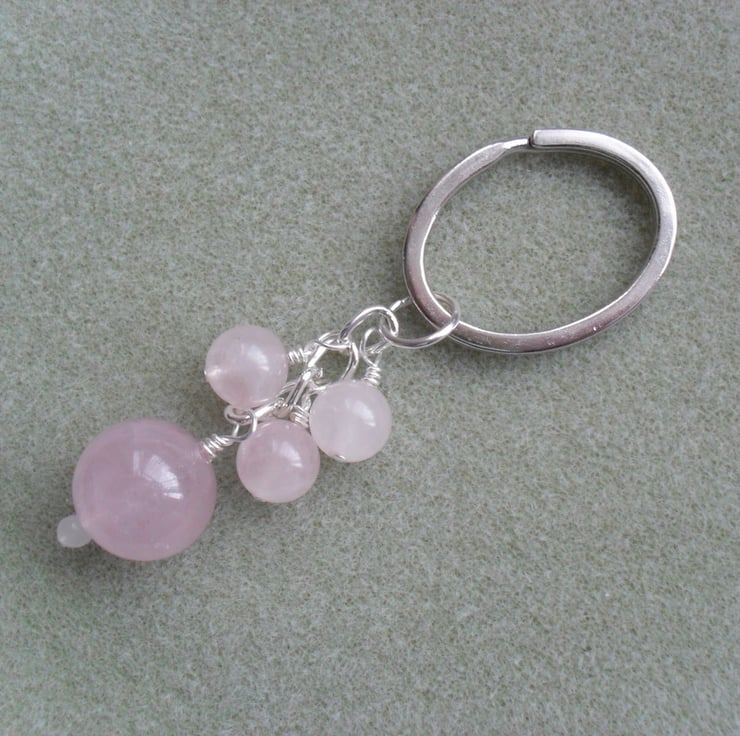 Keyring with Rose quartz semiprecious gemstones attached to a oval strong split ring.