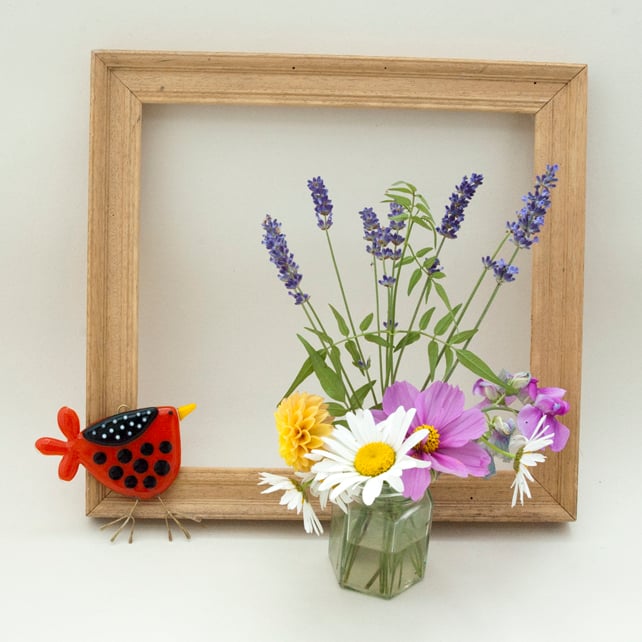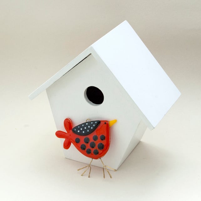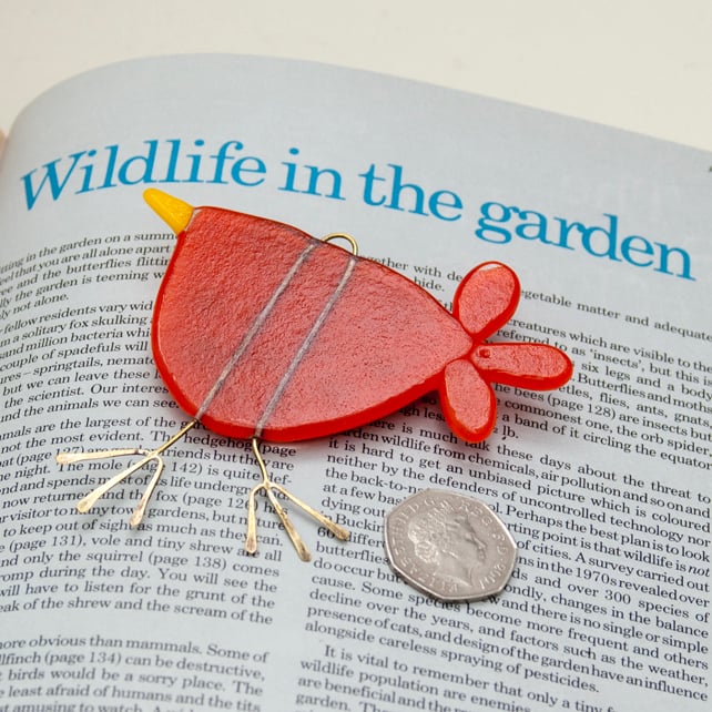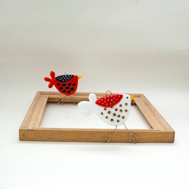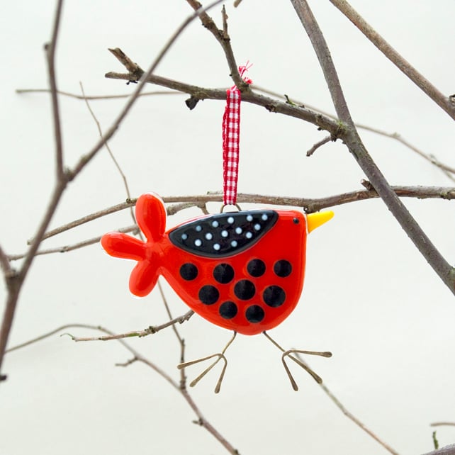 Created from layered Bullseye glass in my Whitstable workshop. This bird has classic red, black and white colour combination with raised spotty decoration on the wing. The body, wing, beak and tail feathers are all hand cut and fused separately before being joined in subsequent firings with the brass hanging wire secured in place. I make adjustments until I’m satisfied with the look and the whole piece is given a final firing to achieve a perfect finish. The wire feet are then soldered in place and hammered to shape. A red gingham ribbon is attached to complete the design.