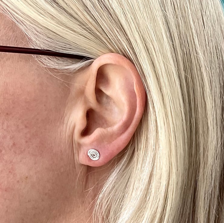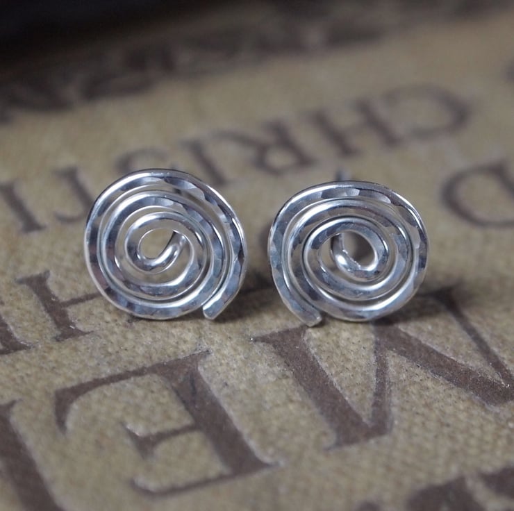 These handmade silver earrings are made in one piece to form a simple spiral stud earring. One spiral goes clockwise the other goes anti-clockwise. They have been lightly hammered to add texture and shine.