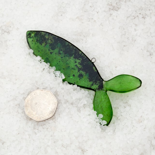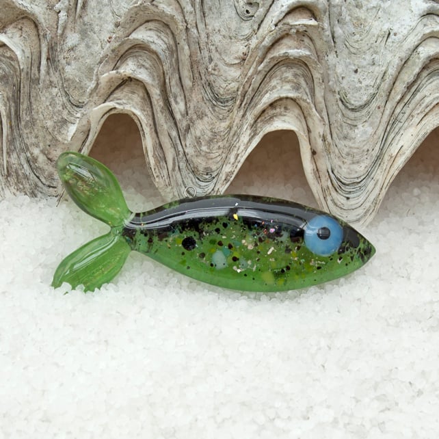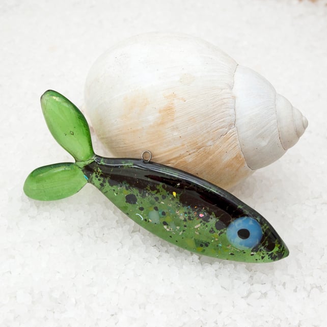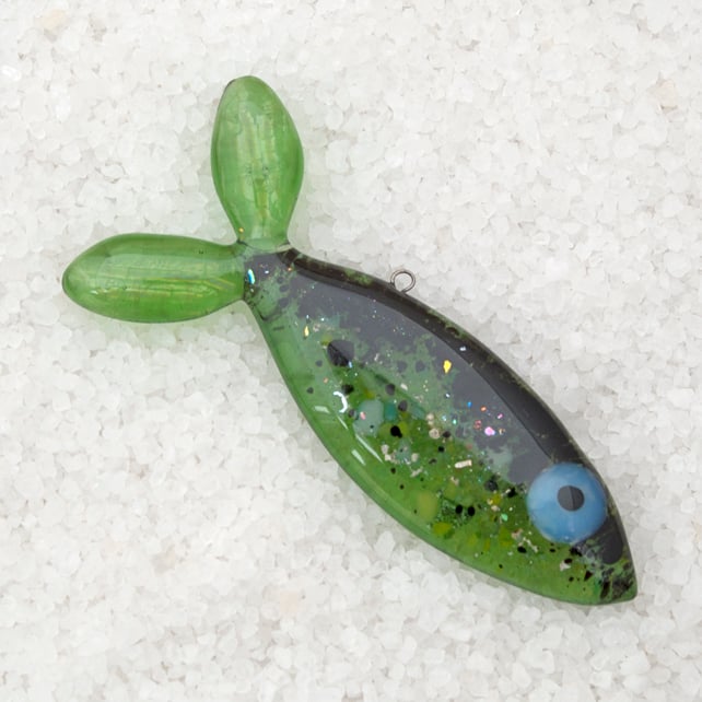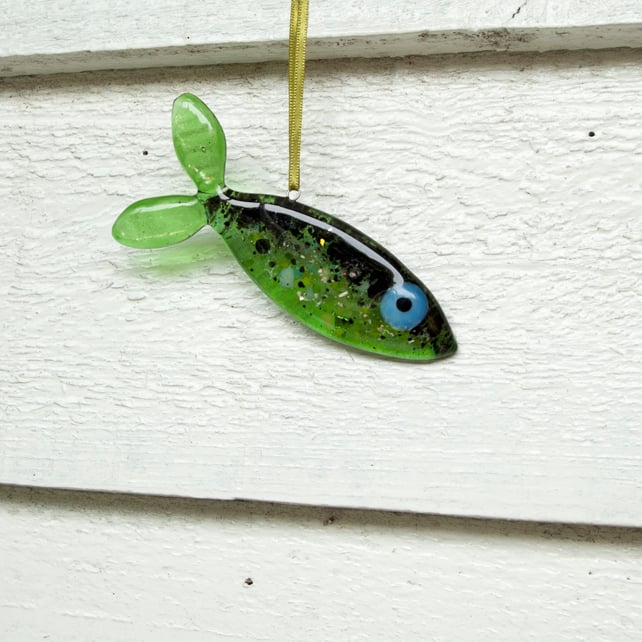 Created from layered Bullseye sheet and ground glass in my Whitstable workshop. The body, eye and fins are all hand cut and fused separately before being joined in another firing with the hanging wire secured in place. Final adjustments are made to the shape and then the whole piece is fired again. This fish has beautiful gold flecks within the design and dichroic flecked detail on the surface that captures the light to great effect. The iridescent green tail has a delicate ribbed effect. A black satin ribbon is attached to complete the design.