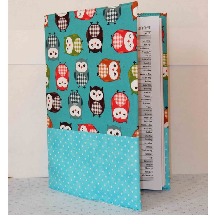 This is a fun A5 (approx. 8.5 x6 inches) week to view diary which is covered in two fabrics, one featuring brightly coloured owls, and the other a toning spot The cover is fully lined and interfaced, and can be removed so that a new diary can be inserted for the following year.