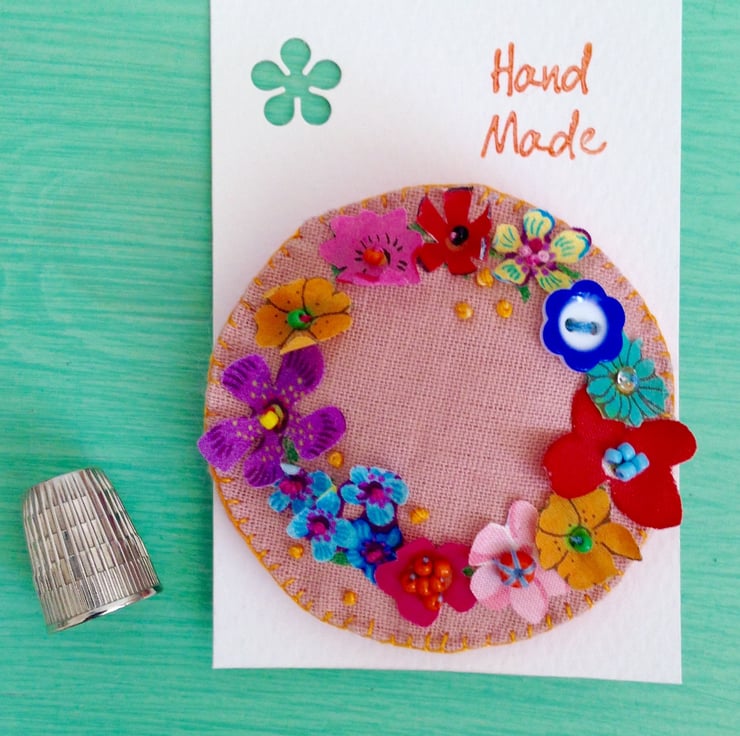 This brooch has been designed and hand-stitched by me. I painted a leaf wreath with fabric paint and have then stitched flowers cut from fabric, mainly Liberty fabric, to the wreath and have embellished them with seed beads, French knots and the odd button.The background fabric is a pale pink linen mix and the circle has been blanket-stitched to a pink felt backing. I have added a small amount of stuffing and a circular card inside to give the brooch some stiffness. I have then stitched a safety brooch pin.