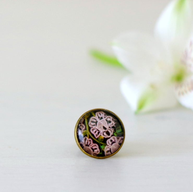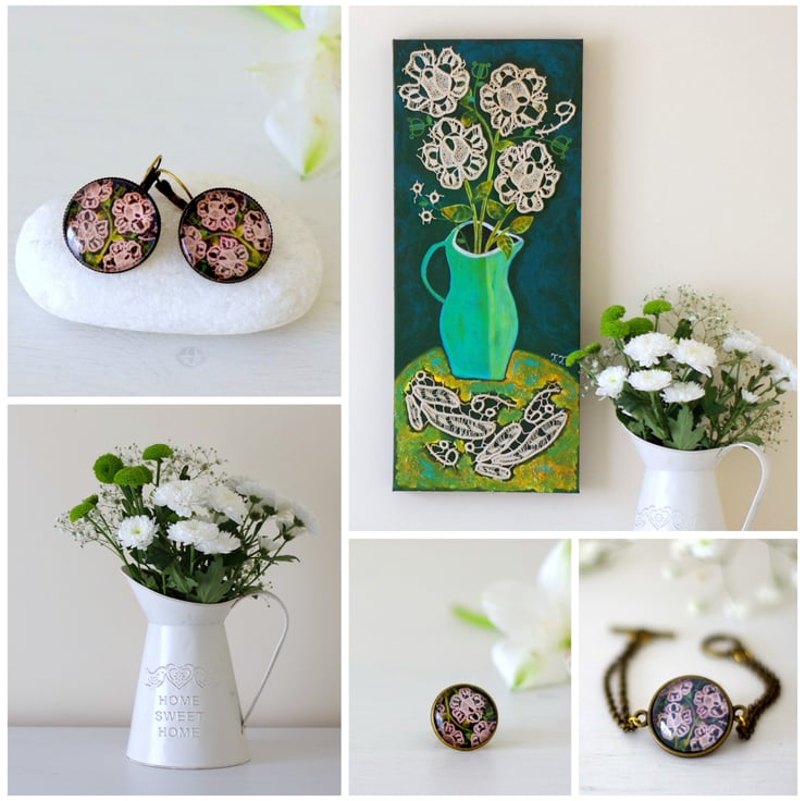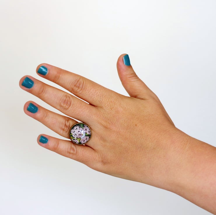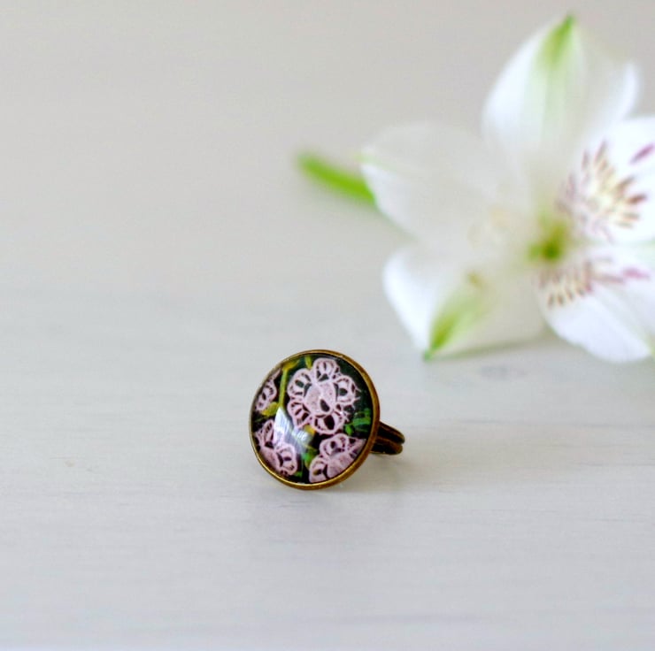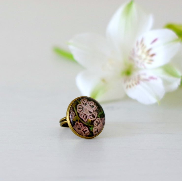 I made this ring using a mini print after one of my original paintings. The original painting is a mixed media still life artwork in which I used pieces of doily made by my mother. The art print used for this ring is from the floral doily part of the painting which looks very nice and feminine as a ring. The bronze ring is adjustable so it should fit all sizes. The glass cabochon is 20 mm.