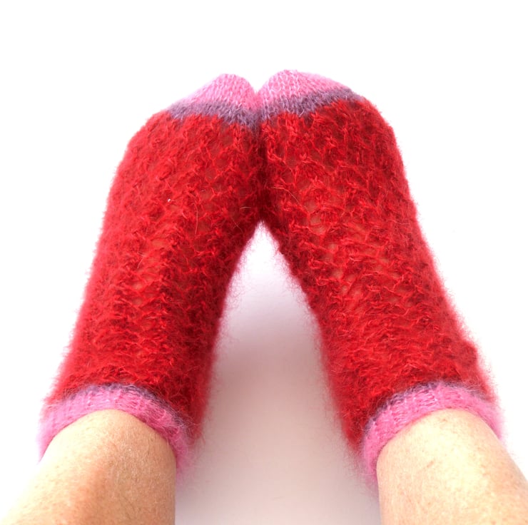 Soft hand knit luxury Christmas red / pink bed socks. Hand knitted in kid silk mohair (mix of mohair and silk) , so soft and luscious. These simply slip on the feet for wearing in bed.