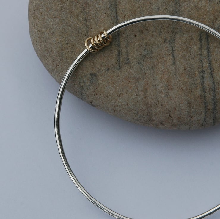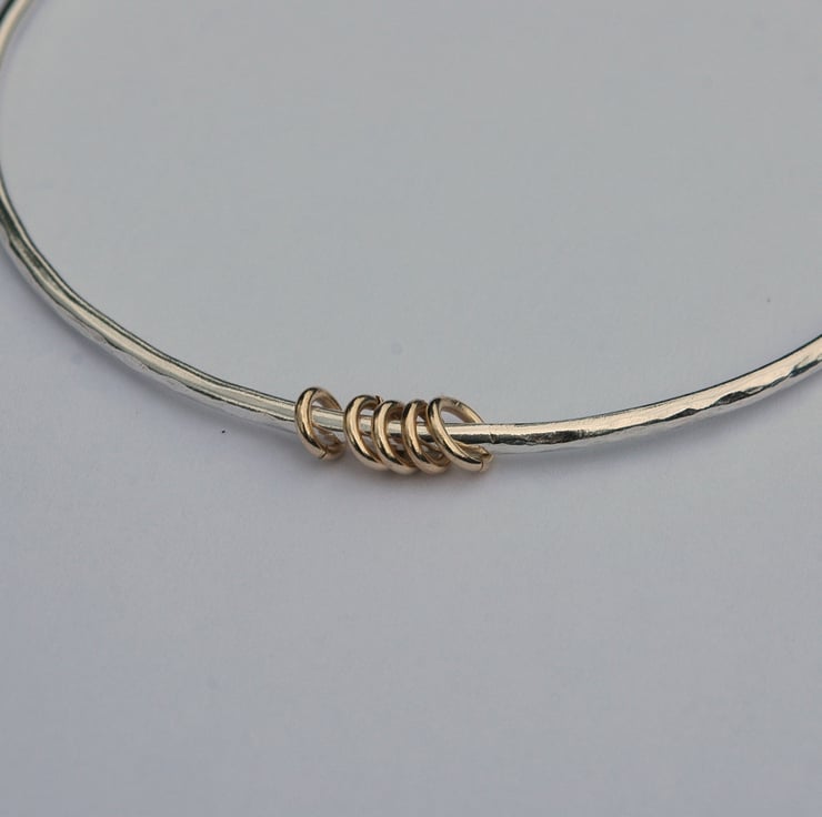 This lovely bangle makes an ideal Christmas or anniversary present! It is made from 2mm wide sterling silver which has been forged with a ball-pein hammer to create a dimpled texture. I have added five little rings made of 9ct gold, which spin and scoot around the silver bangle. Traditional hallmarks have been applied to the inside by the London Assay Office and the whole bangle has been tumble-polished to a sparkly shine.