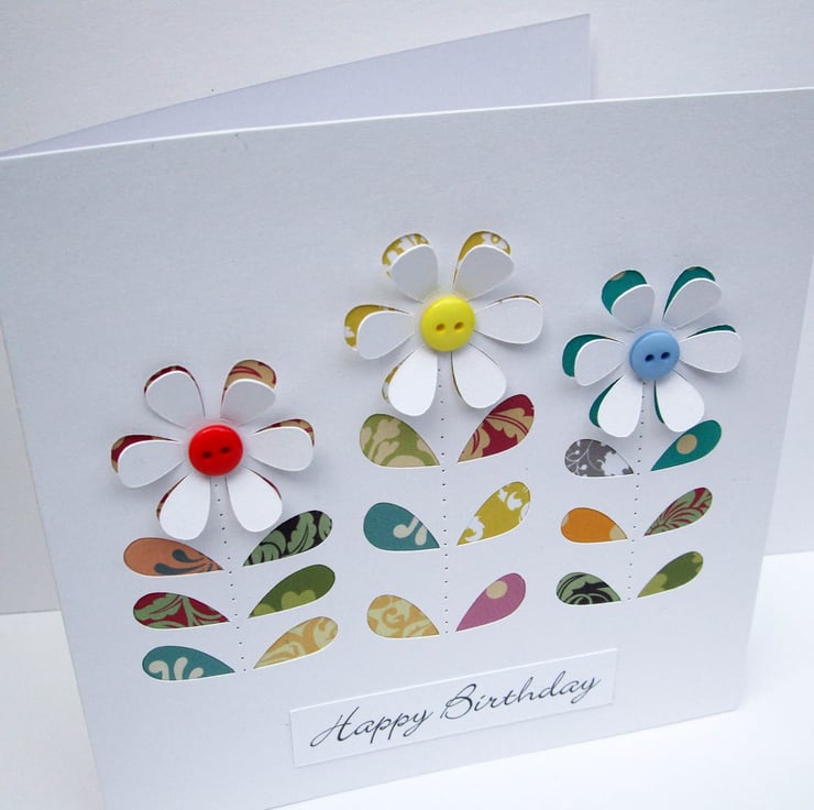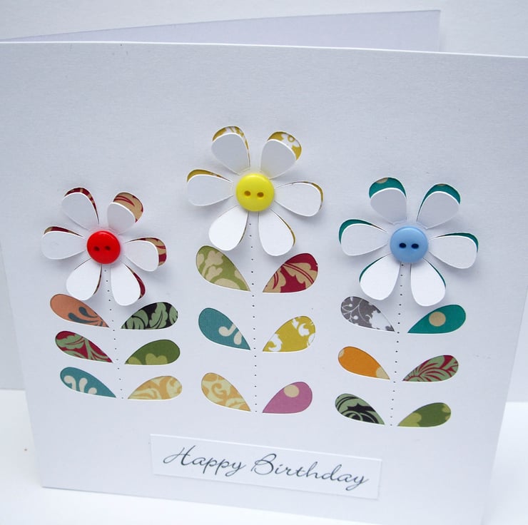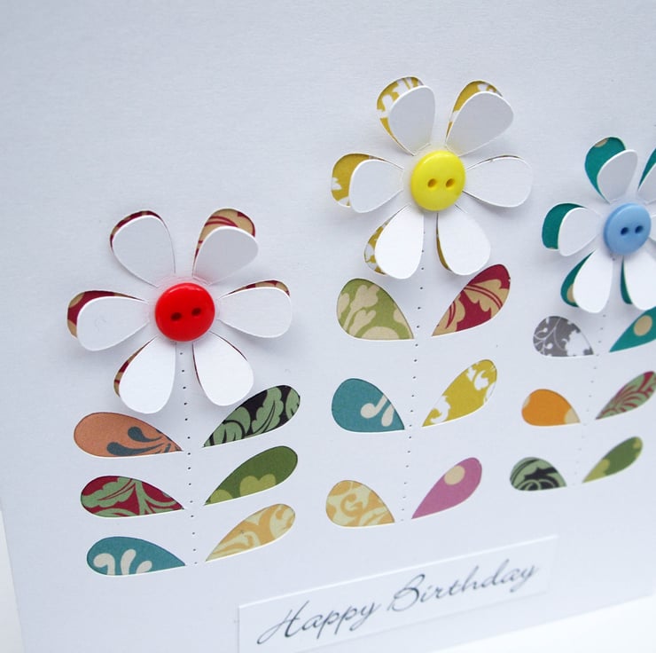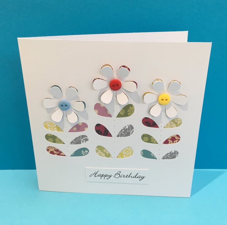 This pretty birthday card has a paper cut design of flowers with colourful leaves, each with a different pretty patterned paper stuck behind it and a button centre on each of the flowers. The perfect birthday card for a special person.