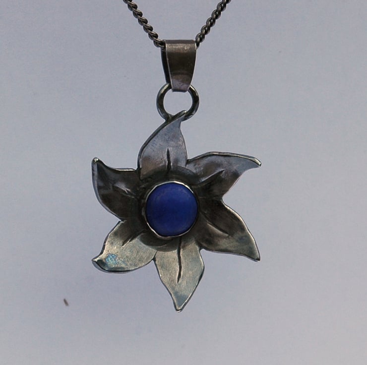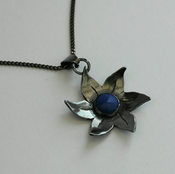 This unusual pendant is made from sterling silver which has been oxidised to a dark colour to add drama and give it a sophisticated antique-style patina. I used a piercing saw to cut out the setting from 1mm thick sterling silver sheet. It is in the style of a flower with six petals. At its centre is a round cabochon of intense blue Lapis lazuli, 8mm in diameter. The pendant has a hand-made bail and is supplied with a sterling silver chain, 18in (45cm) in length, which is also a dark antique colour. The pendant measures 3x2.4cm and weighs 4.0g. It has been hallmarked on the reverse side by the London Assay Office.