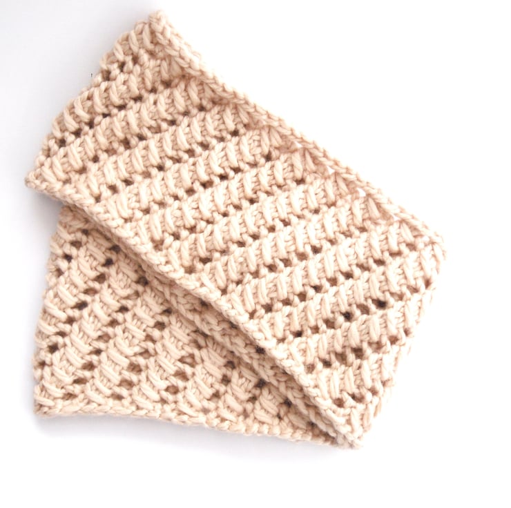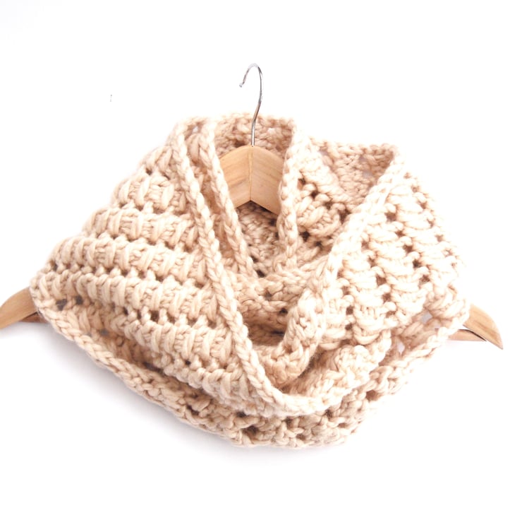 Lace knitted chunky cowl / infinity scarf in a natural cream (with a tinge of pink). Hand knitted in a 80% acrylic , 20% wool yarn. The wool fibers make this yarn especially warm in winter, whereas the acrylic makes it super to wash and look after,