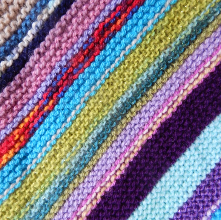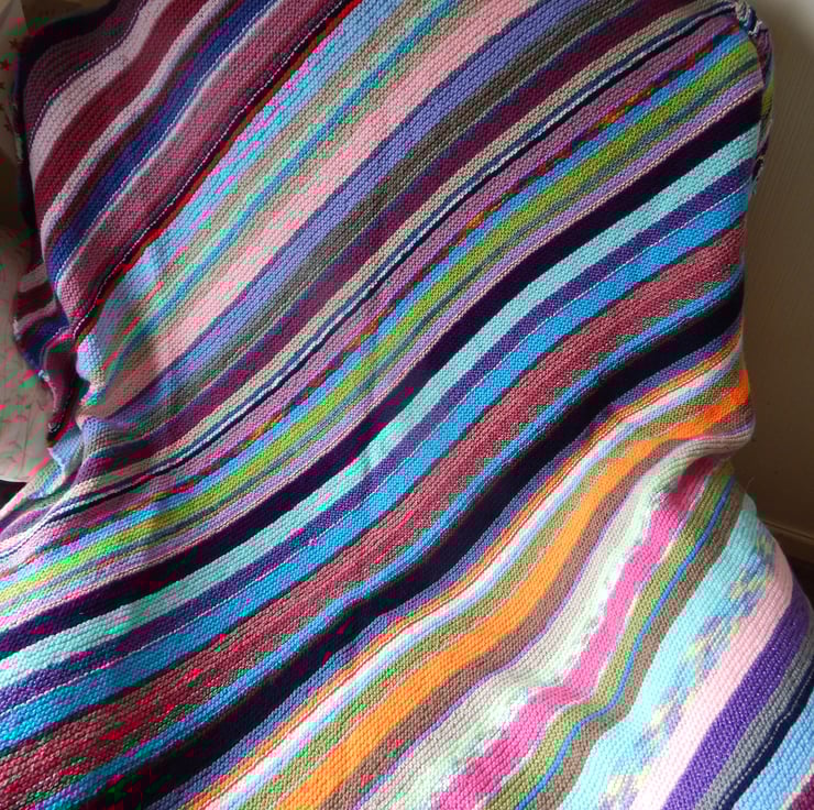 This blanket is knitted in diagonal stripes using all sorts of different coloured yarns which gives a magical effect. It measures 44 x 44 inches and is great for popping over your knees on a cold evening while you're watching the TV, or as extra warmth over your duvet at night. Or simply just looking beautiful, draped over the back of an armchair or your sofa.