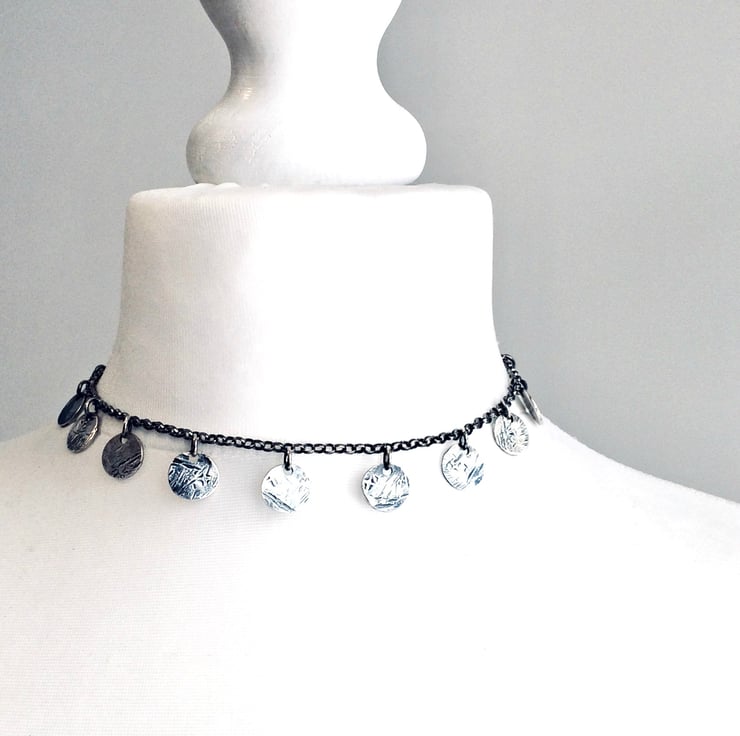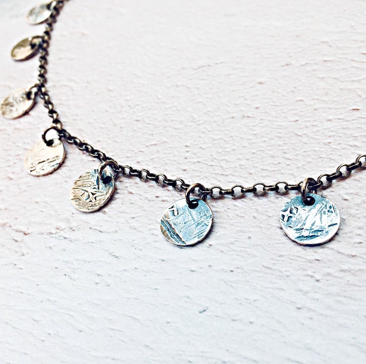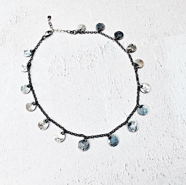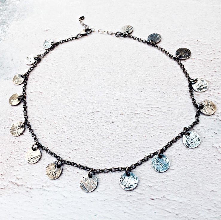 The hand-crafted necklace features around 16 textured Sterling Silver discs (depending on the length) each lovingly beaten up with a variety of our smithing tools.