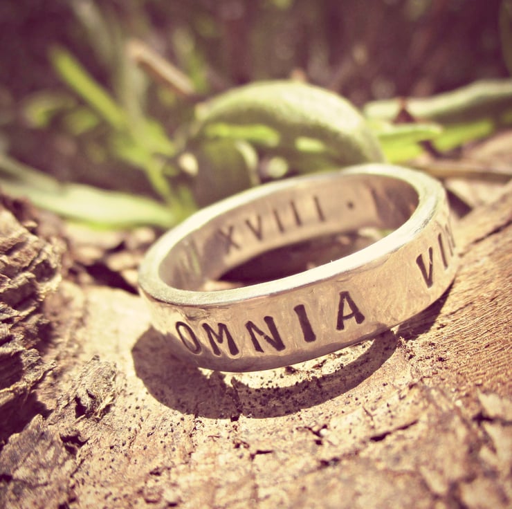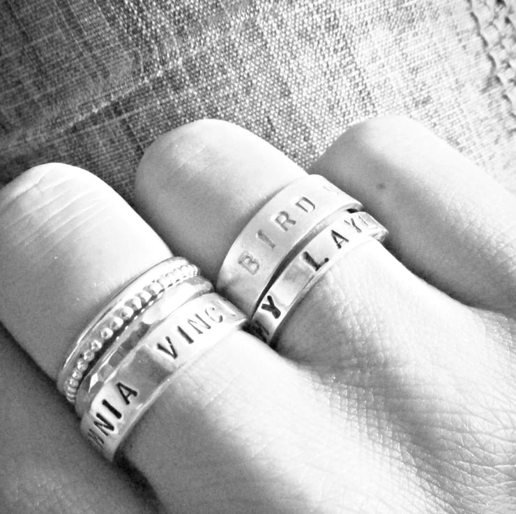 Your Sterling Silver ring is hand stamped, letter-by-letter with your chosen date (in Roman numerals or standard numerals - your choice) and your message. One inside and one out.