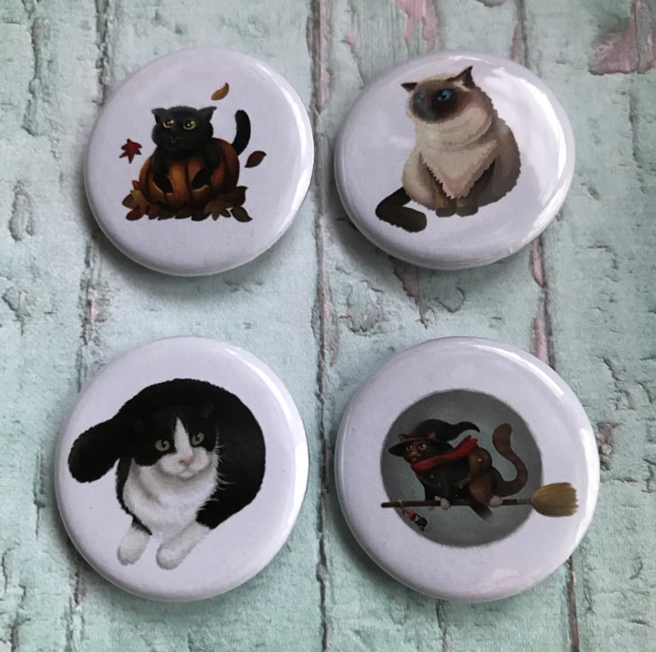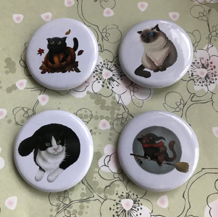A lovely set of 4 cat design badges. Standard, 3cm (1.25") round badge, covered with scratch and UV-resistant Mylar. Metal and plastic. With a steel pin back.
