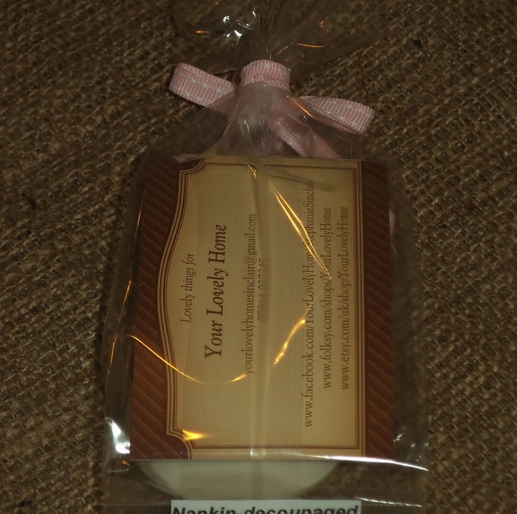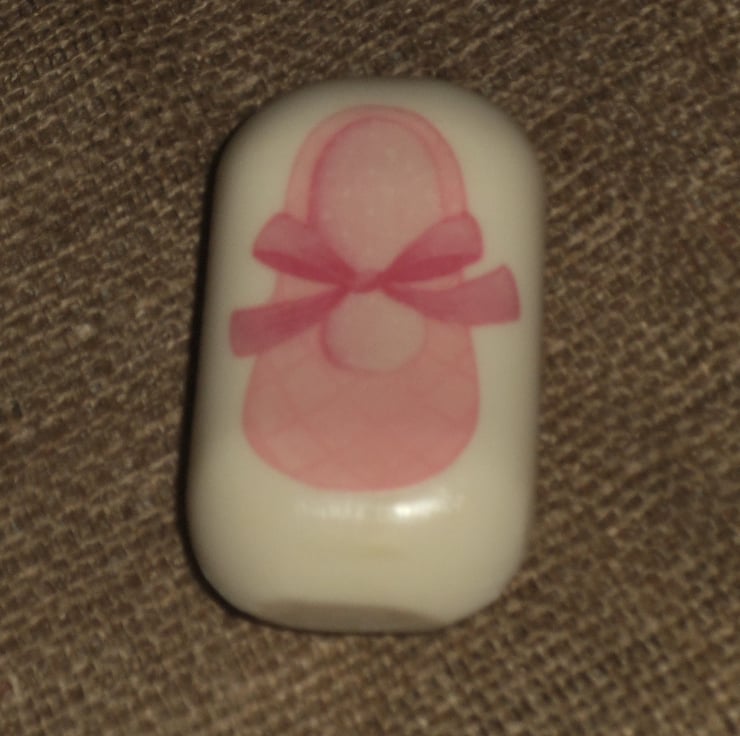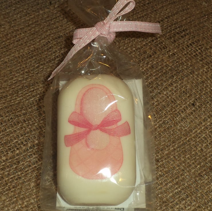 A cream coloured soap (Johnson’s Baby Soap) napkin decoupage decorated on one side with a sweet, pink, little baby shoe with a ribbon fastening.