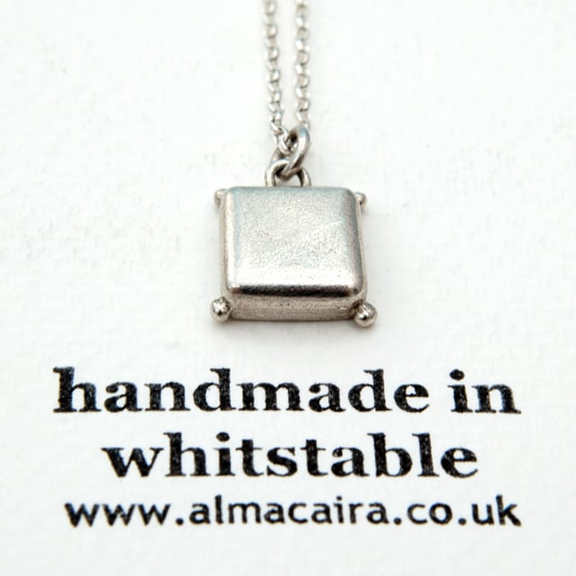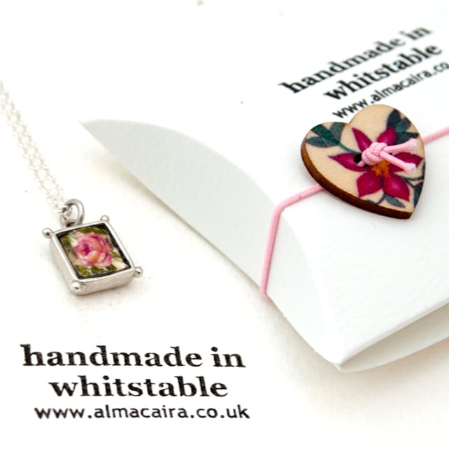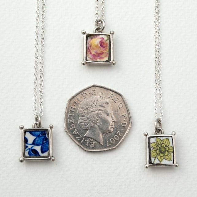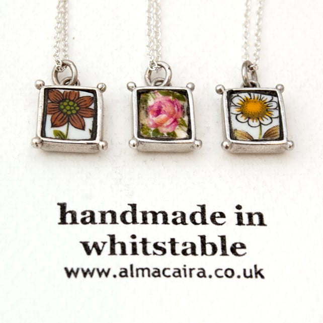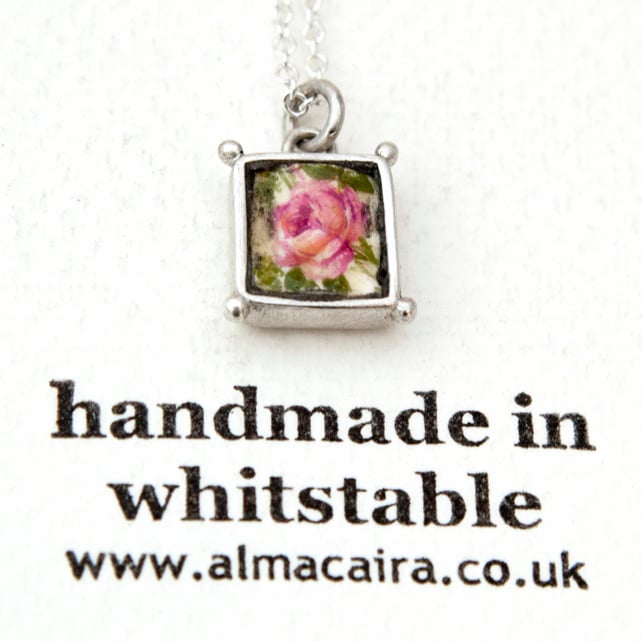 Created from sterling silver with a sterling silver fine belcher chain in my Whitstable workshop. The flower tile insert has been carefully cut from a vintage china plate and shaped to fit snugly before securing with an epoxy resin. Supplied with a recycled card gift box (sent flat for postage but very simple to assemble).