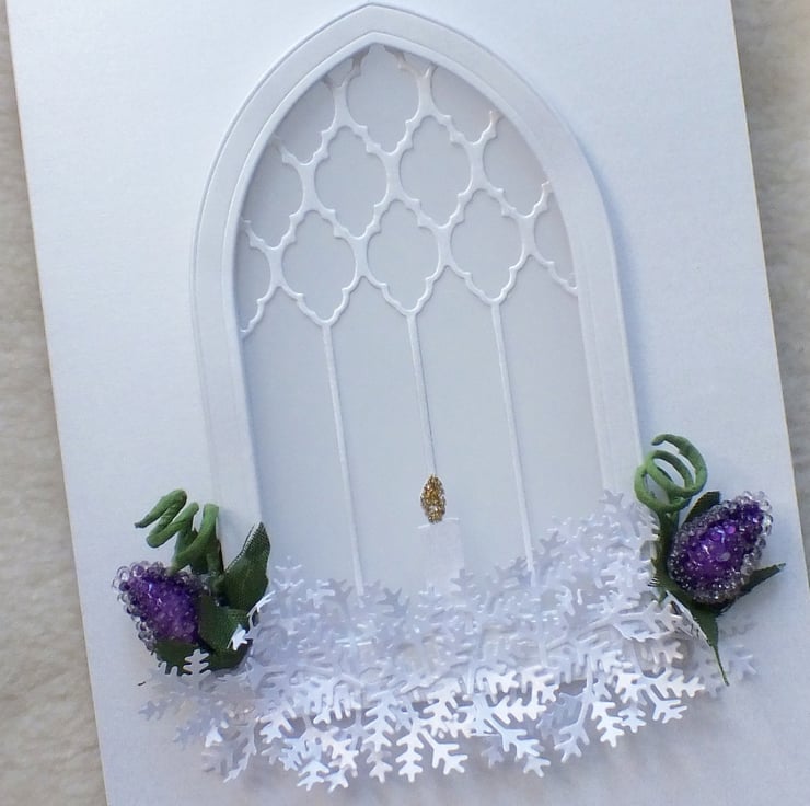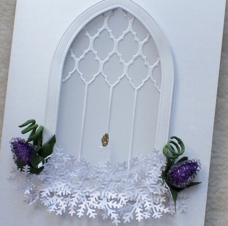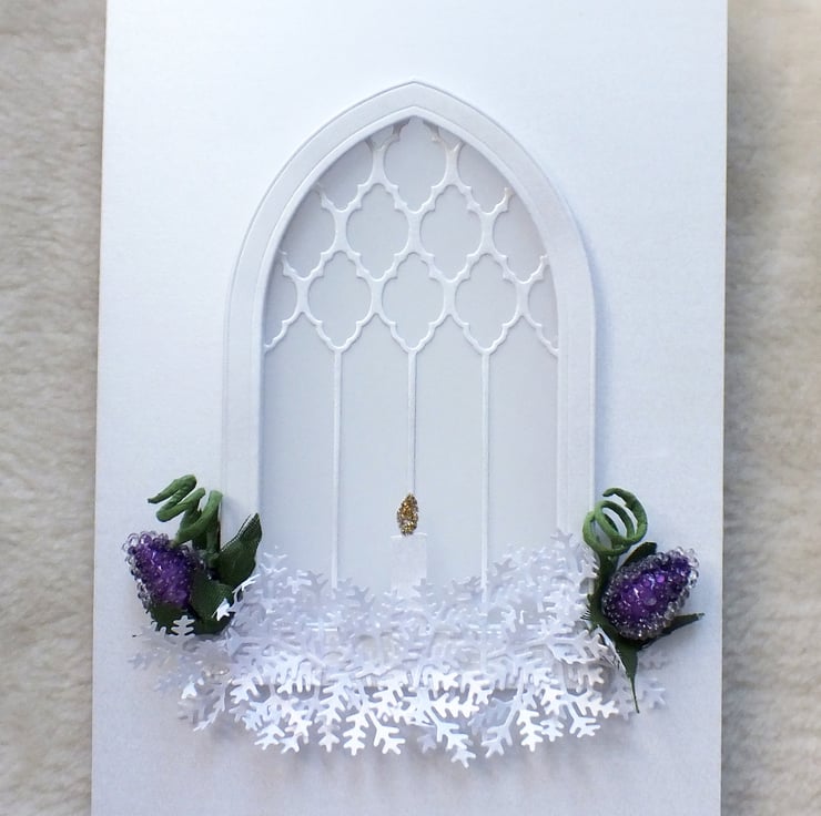 A simple, yet contemporary handmade design, this sympathy card will be received with much gratitude. 3D and die-cut from premium quality pearlised card stock with ethereal window feature, using translucent vellum, beaded purple flower buds, green coils, and candle. Includes the sentiment 'With Deepest Sympathy' inside. Approx. 5"x7" in size.