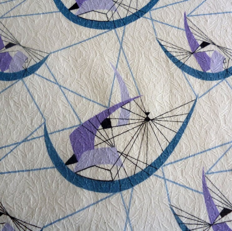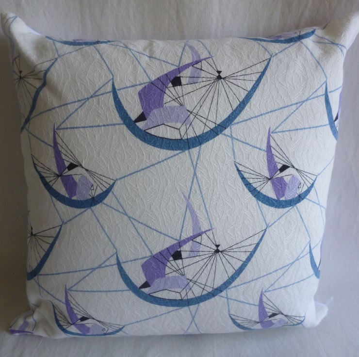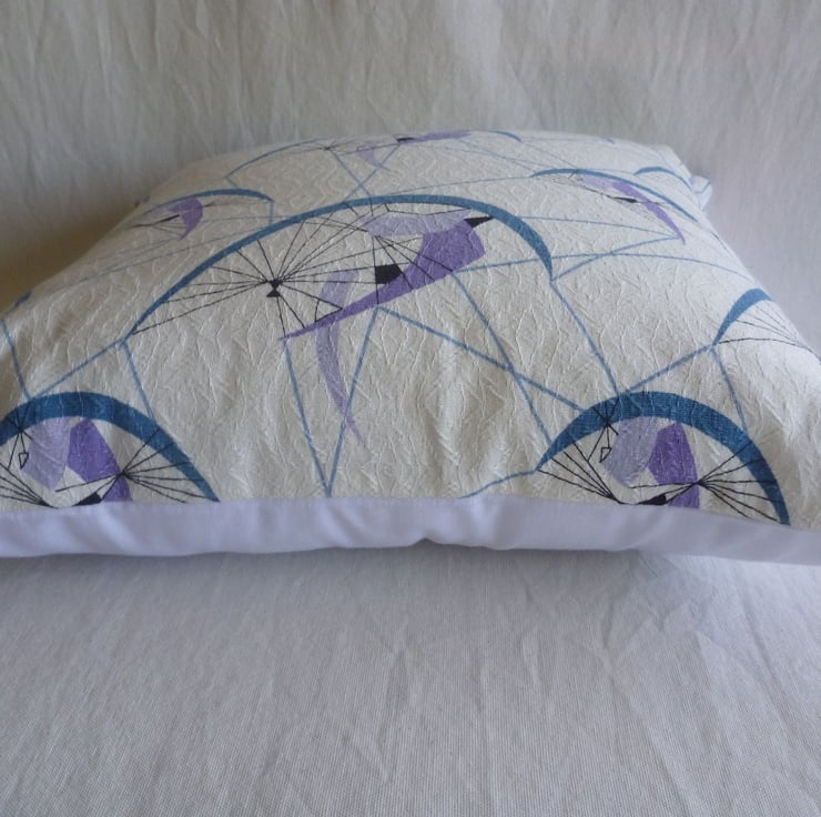 This cushion cover is made from a piece of unused vintage cotton barkcloth fabric which features an unusual design in lilac and black on a textured white background and dates from the 1950s. The back of the cushion cover is made from plain white cotton twill and the cover fastens with a zip at the bottom. The cover is made to a high standard and all internal seams are overlocked for strength.
