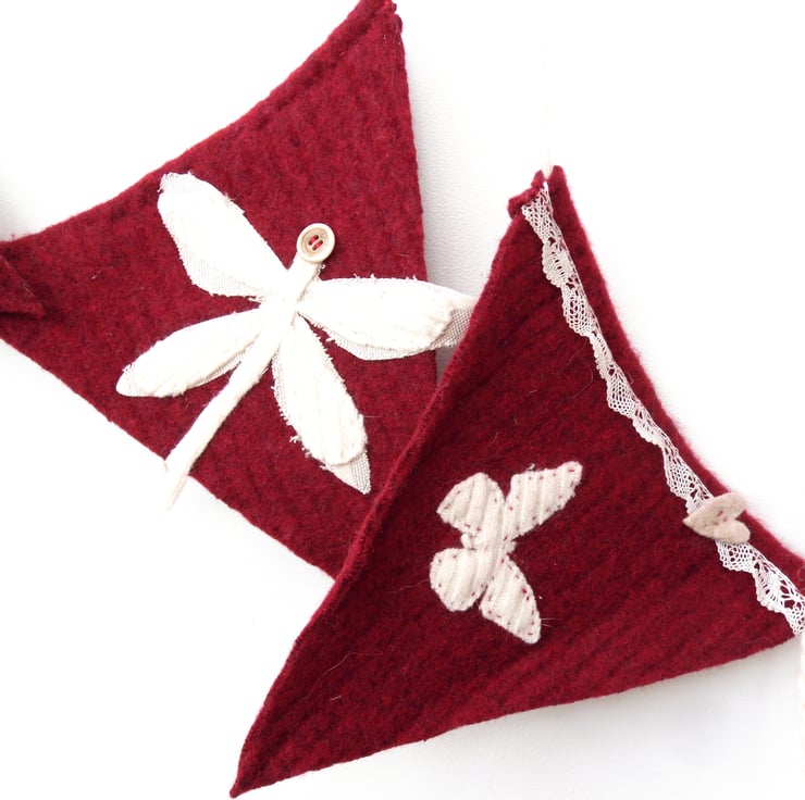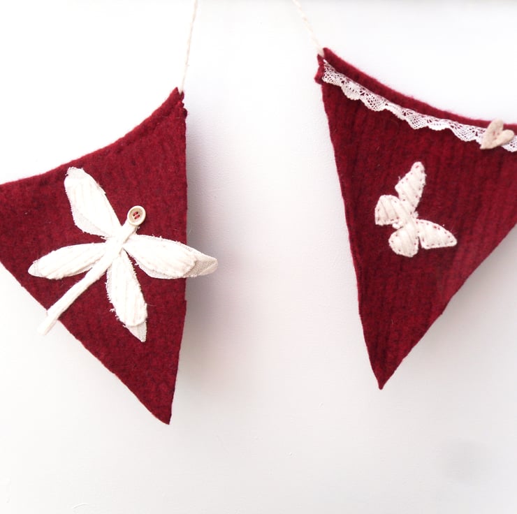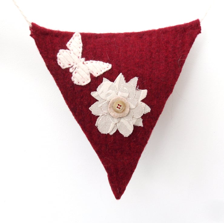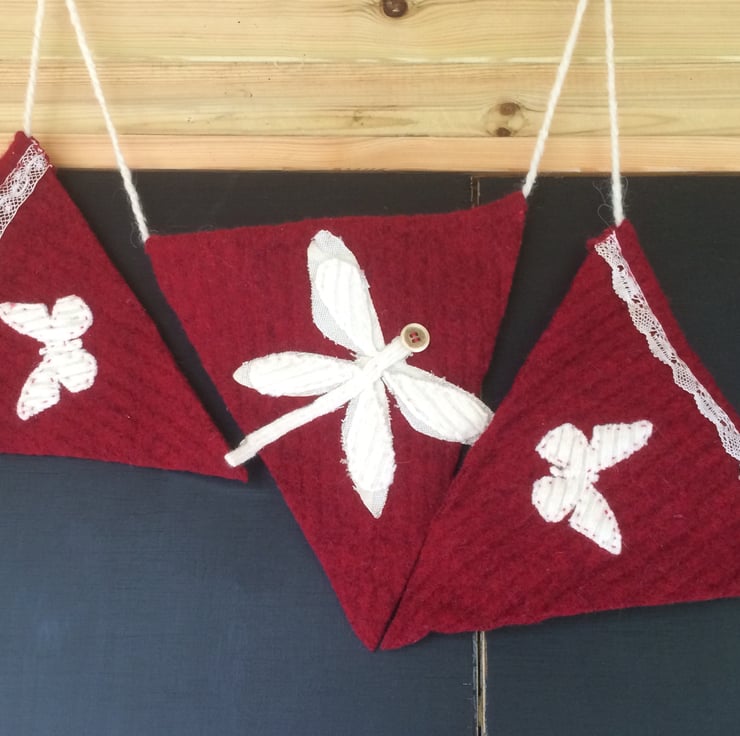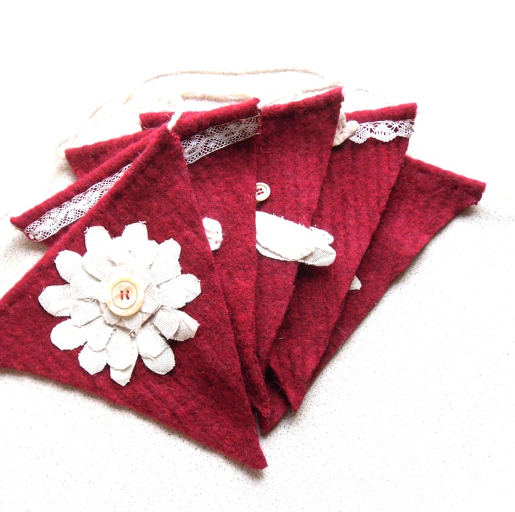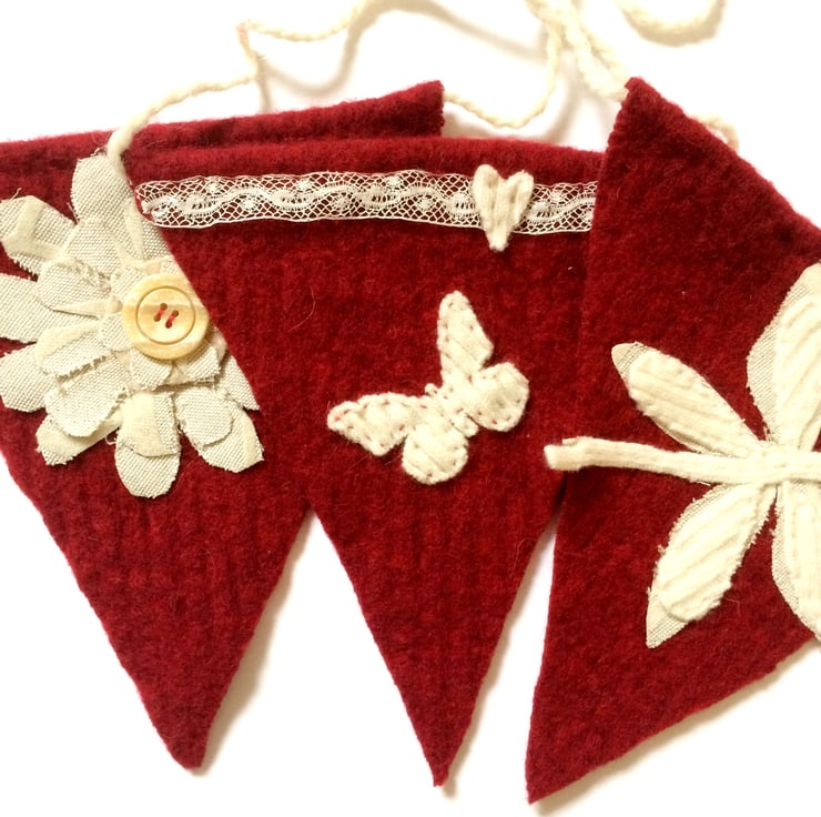 Beautiful red wool bunting, hand sewn using all recycled materials. A mix of felted old lambswool sweaters, cotton and linen fabric from sample books , vintage lace and small buttons from old garments have been lovingly brought together to form this wonderful home bunting.