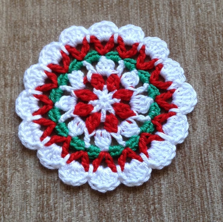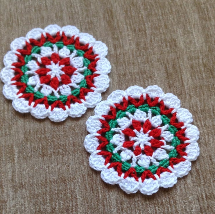 Crocheted set of 2 Mandala style table mat coasters in the seasonal colours of red, white and green.