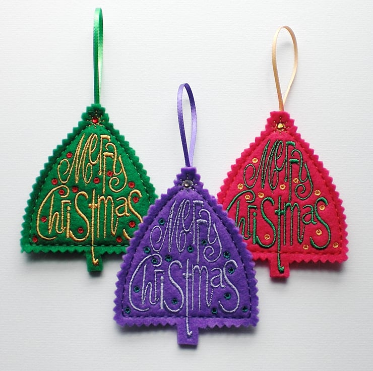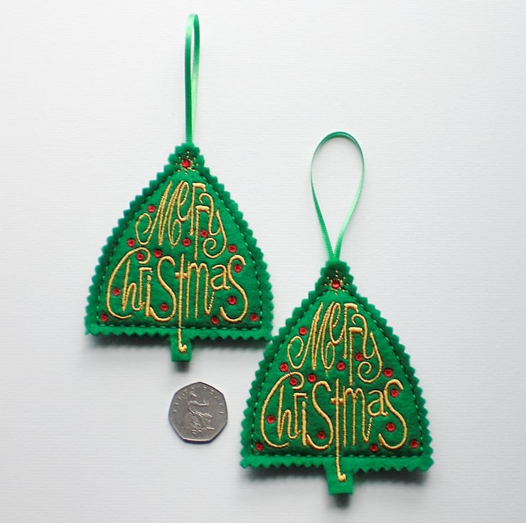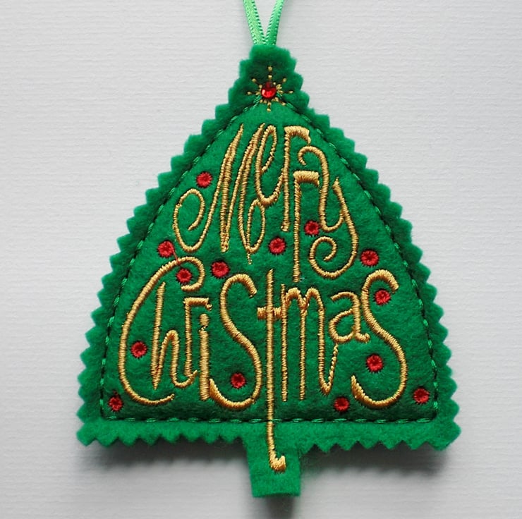 Made from green felt and embroidered with Merry Christmas.