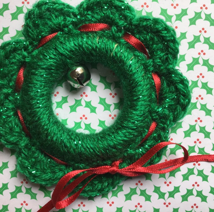 Christmas Tree decoration in the form of a small wreath crocheted in a green sparkly yarn which catches the light beautifully, finished with a red ribbon threaded around and small silver coloured bell.
