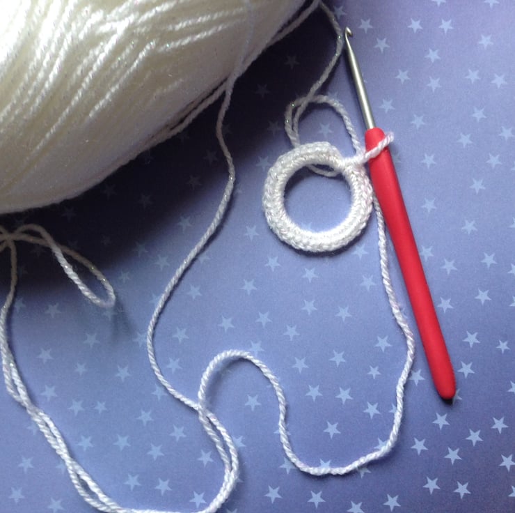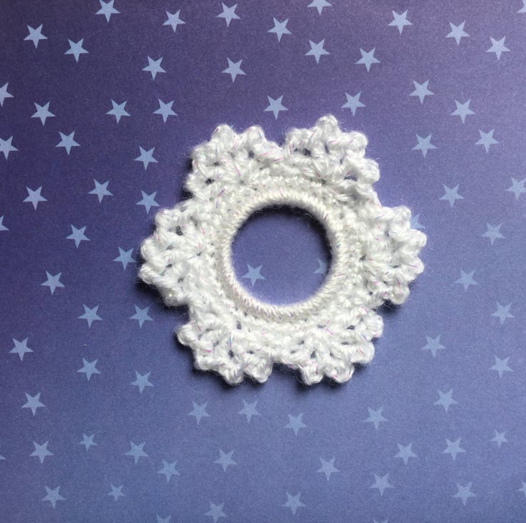 Crocheted Snowflake Christmas tree decoration in a white sparkly acrylic yarn which twinkles beautifully as it twists and turns when hanging.