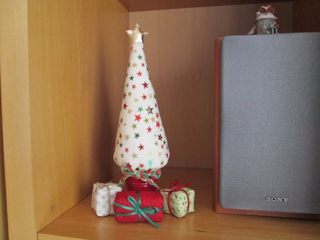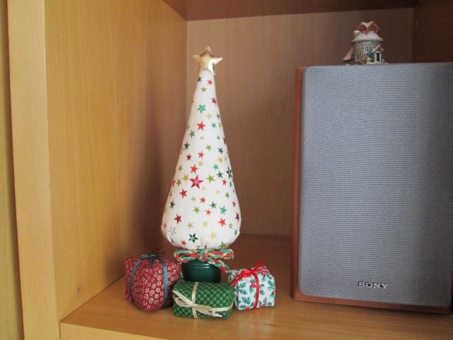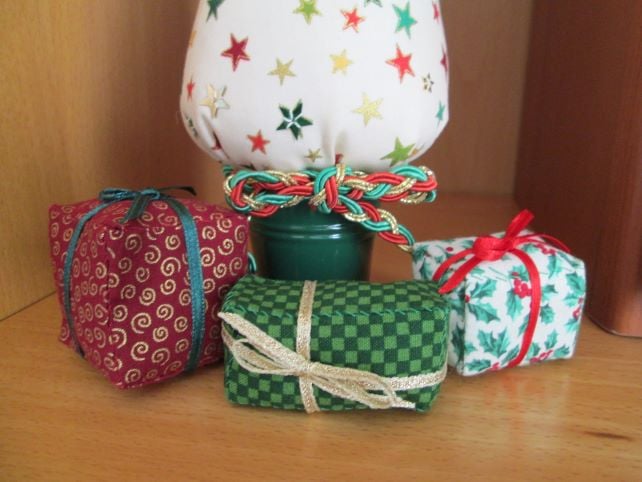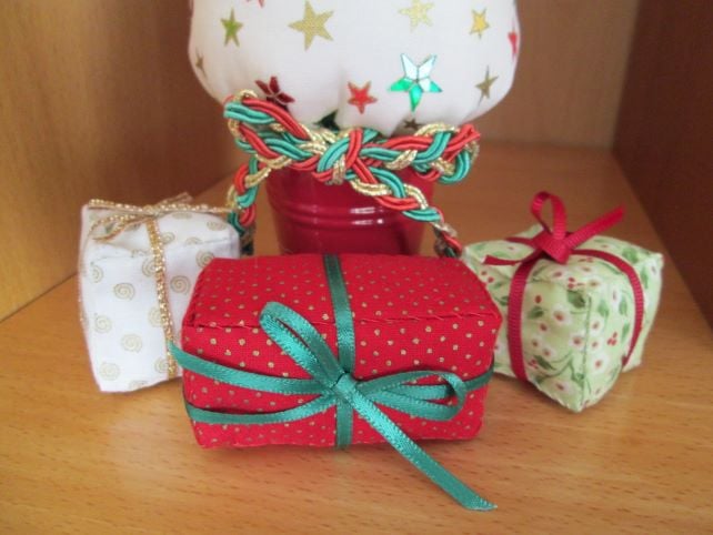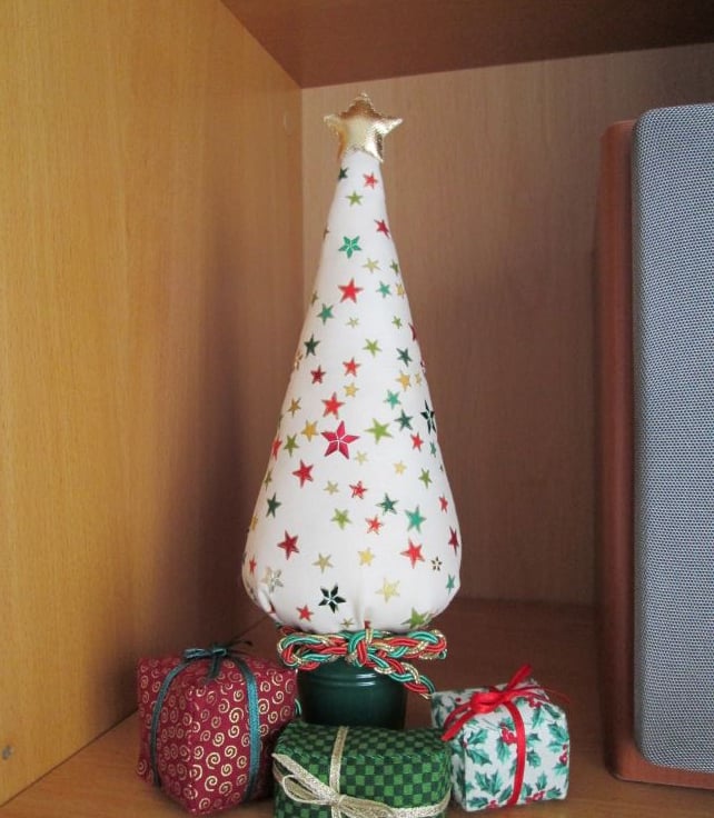 A miniature Christmas Tree in a pattern of festive stars on cream with some stars picked out in star sequins - perfect for anyone who doesn't have space for a full sized tree. Set in either a red or green metal bucket and finished with a plaited braid bow, each tree comes with a set of hand sewn mini fabric parcels to complete the look. Stands approximately 28 cm high. Two available, one in a red bucket, the other in a green bucket.