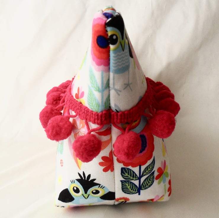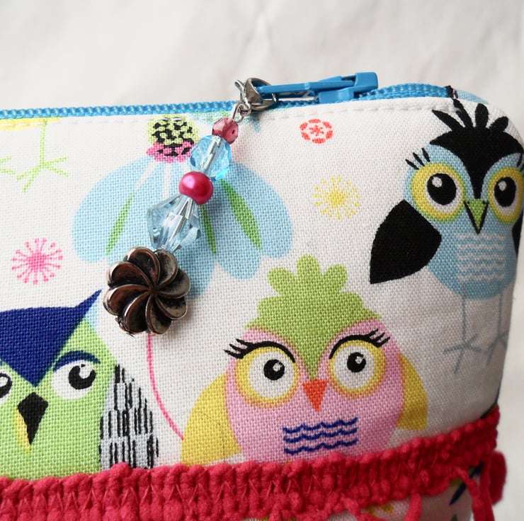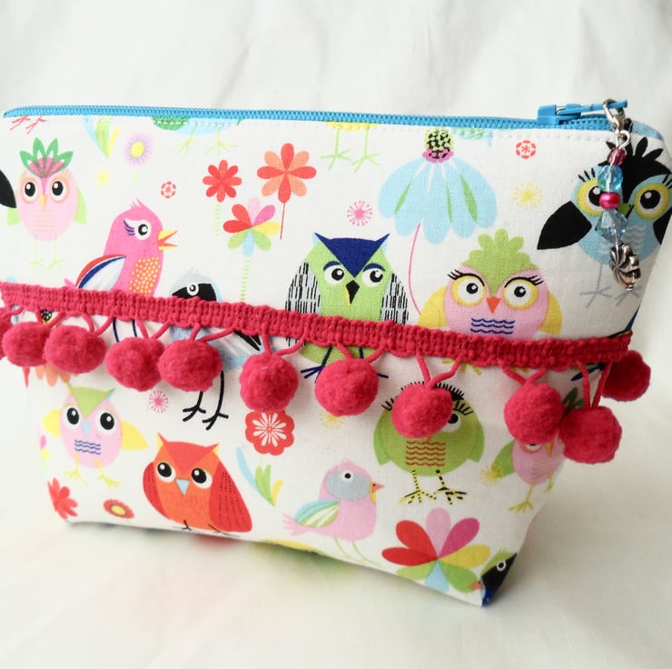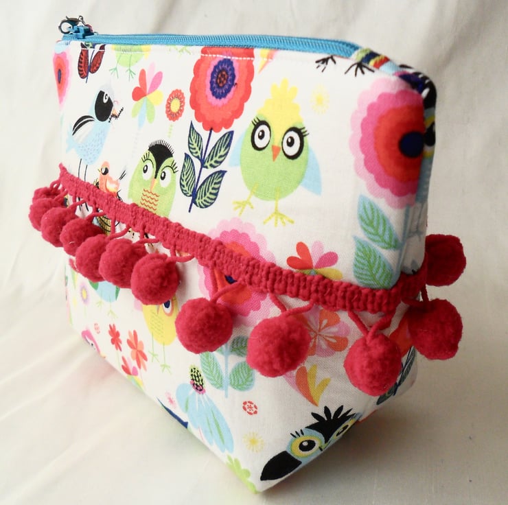 This fab make-up bag is handmade using a cotton fabric with a cute bird design. Both the front and back are decorated with a cerise bobble trim and there is a beaded zip pull in complementary colours. The lining is a purple ditsy print cotton.