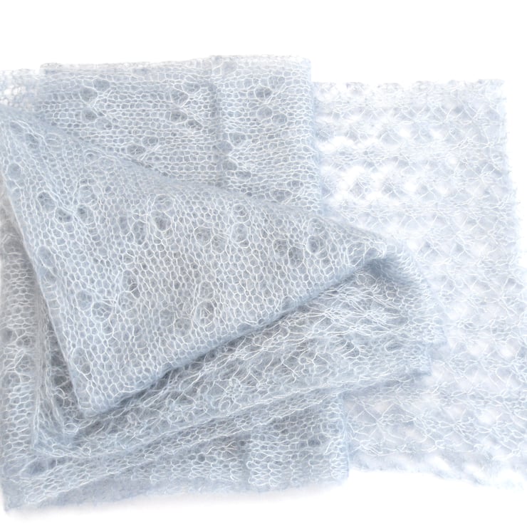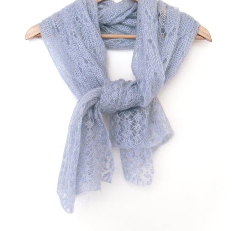 Bridesmaid or Brides wedding wrap hand knitted in a kid silk haze mohair. Wonderfully soft and fluffy , knitted in 2 lace designs , a rather complicated lace border to each end with a simple flower design in the center