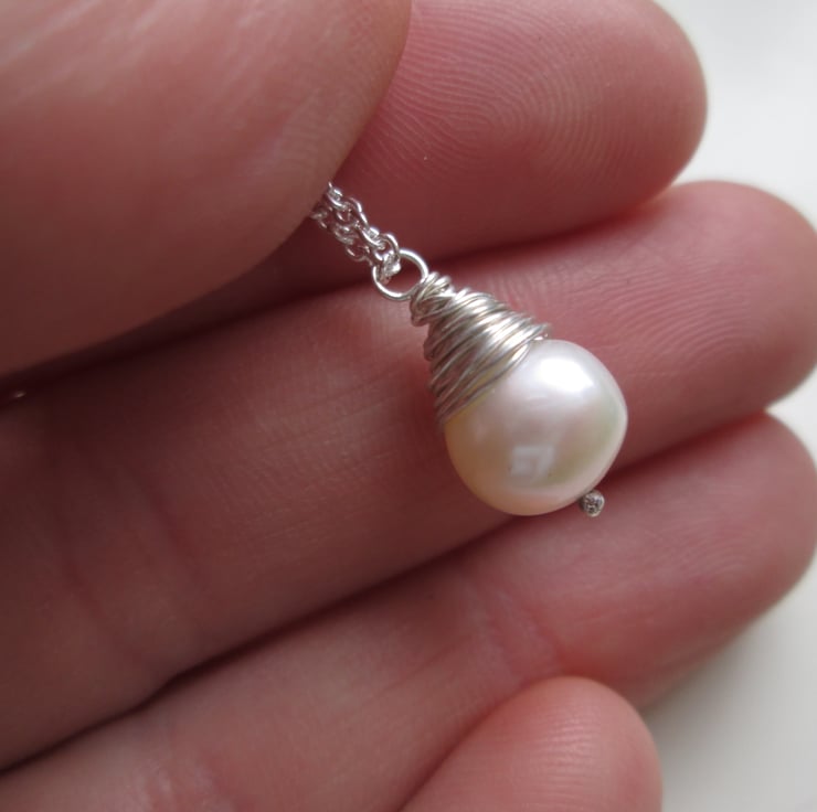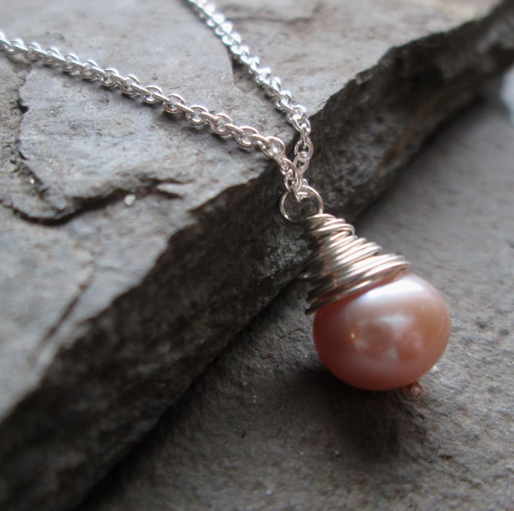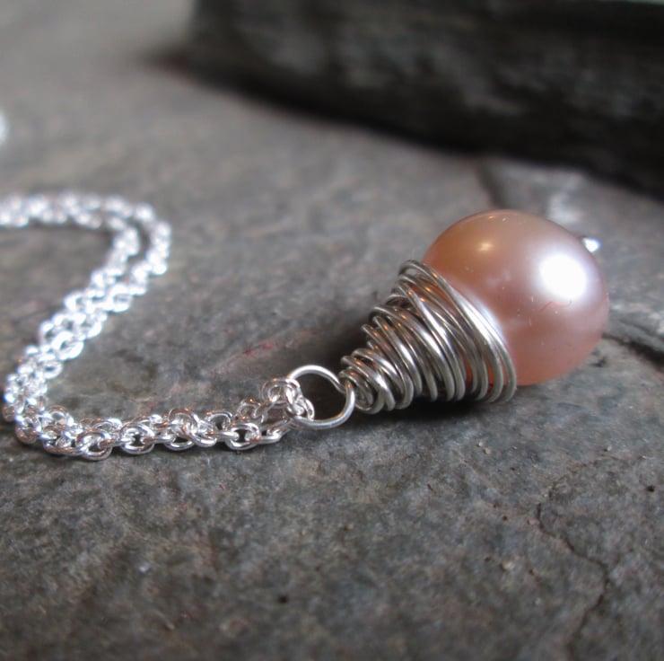 Pearl necklace featuring a single peach freshwater pearl (8mm) wrapped in sterling silver wire and hung delicately from an 18" sterling silver (925) chain (16" on request).