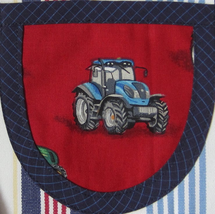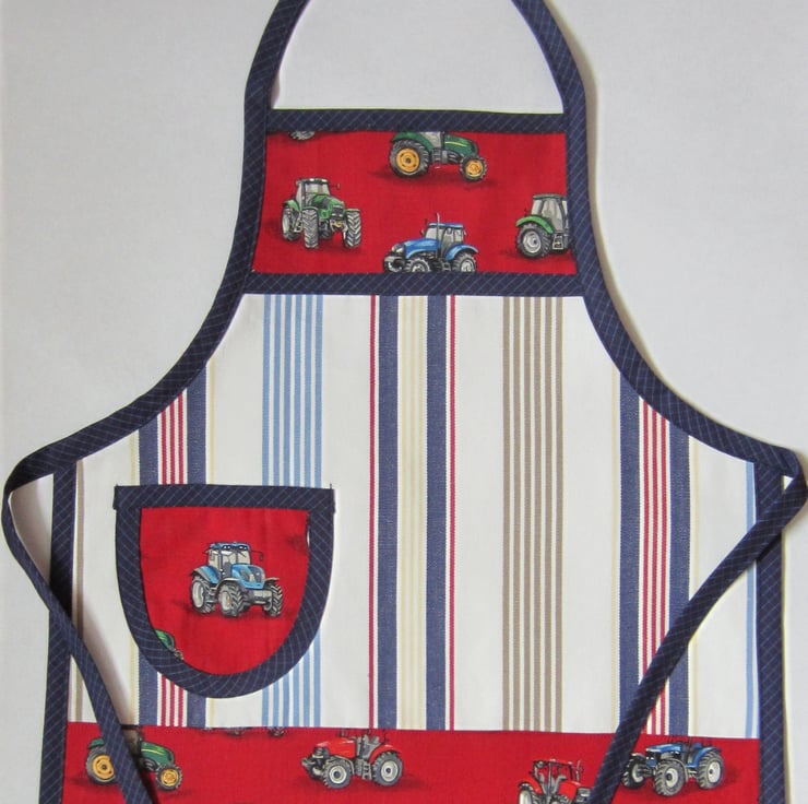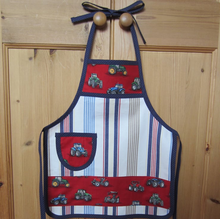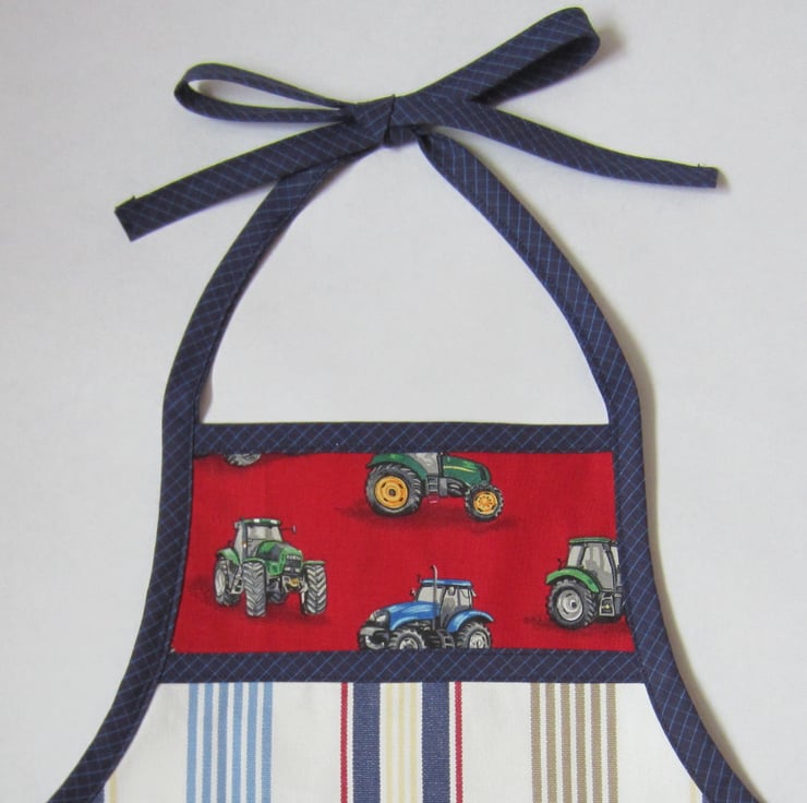 Striped apron with red tractor panels and pocket. Suitable for a child aged about 2 to 4 years old. It measures 38 cm wide and 46 cm long and fastens with a bow at the waist and neck.