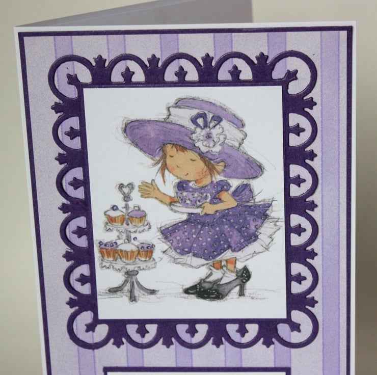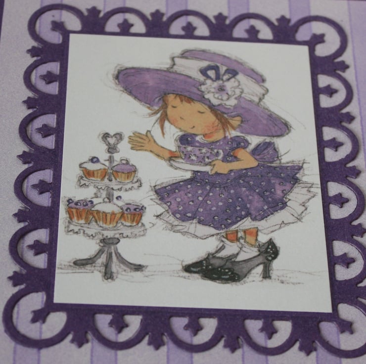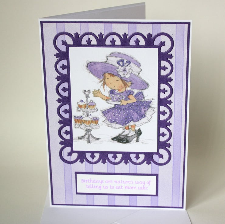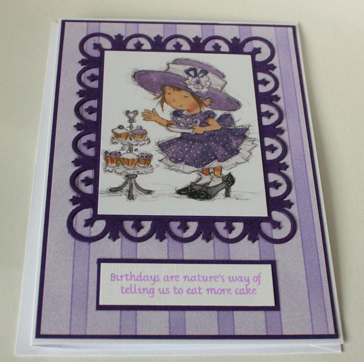 Pretty birthday card featuring an image of a girl having tea and cakes. This has been layered onto a die cut purple frame and onto colourful striped background paper. The message reads: "Birthdays are nature's way of telling us to eat more cake". A sentiment we can all agree on!
