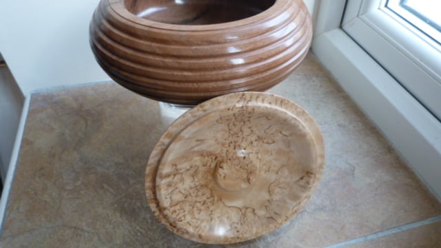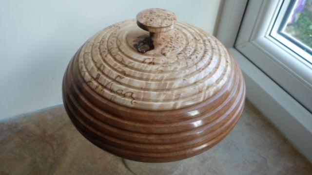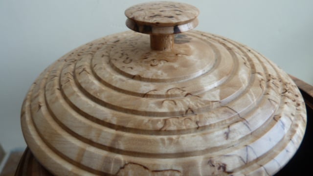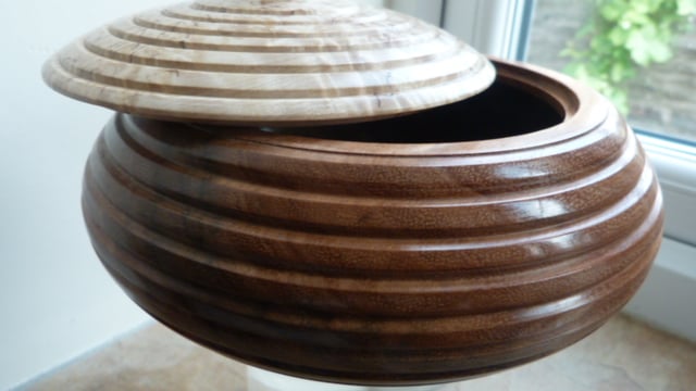 THE MAIN BODY OF THE PIECE IS MADE OF INDIAN LAUREL WITH A WALL THICKNESS OF 10MM, THE LID IS IN MASAR BIRCH. THE WHOLE OF THE EXTERIOR DECORATED WITH A VERY DELICATE V CUT. FINISH IS IN BEESWAX AND CARNAUBA WAX.