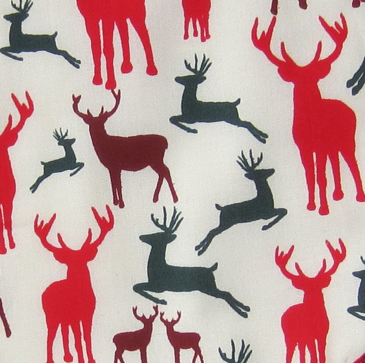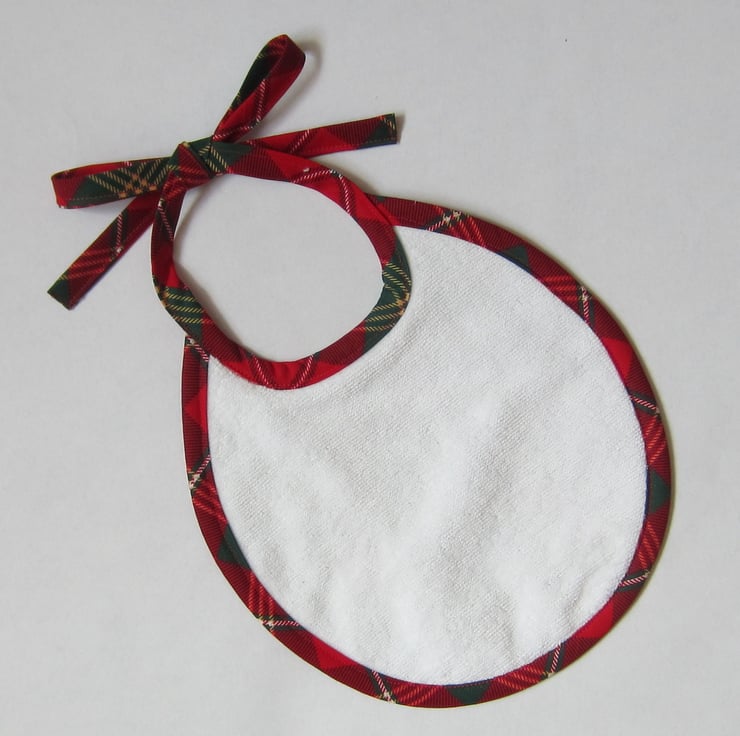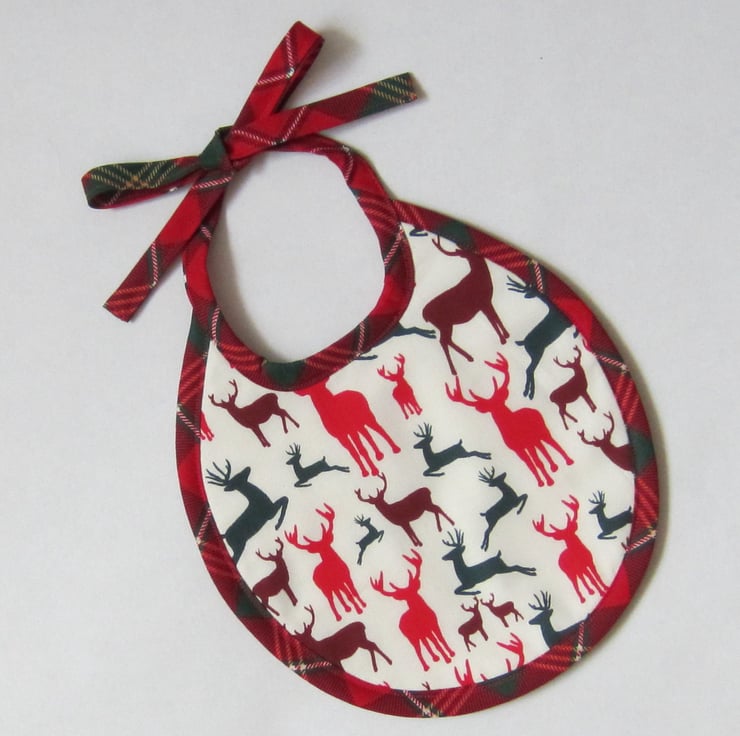 1st size babies bib featuring red, brown and dark green stags on cream background, edged with red and green tartan bias binding and backed with a lovely soft velour white towelling. Suitable for newborn to babies aged about 6 months. It measures 21 cm wide and 22.5 cm long. Fastens with a bow at the back of the neck.
