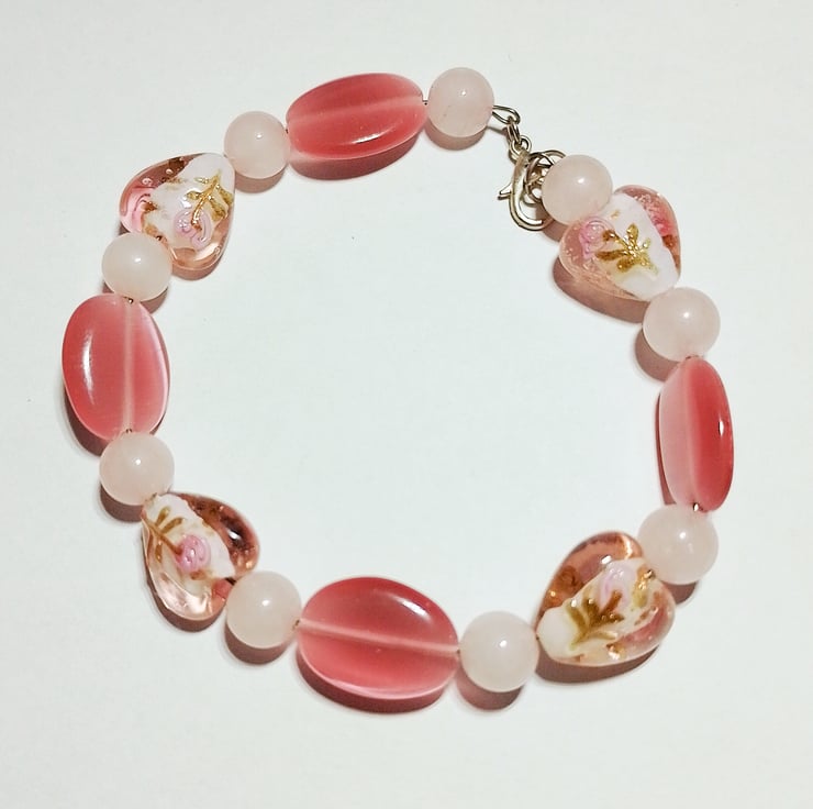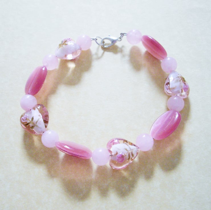 This lovely bracelet is made from pink gemstone and lampwork heart beads strung on memory wire with a silver plated lobster catch.