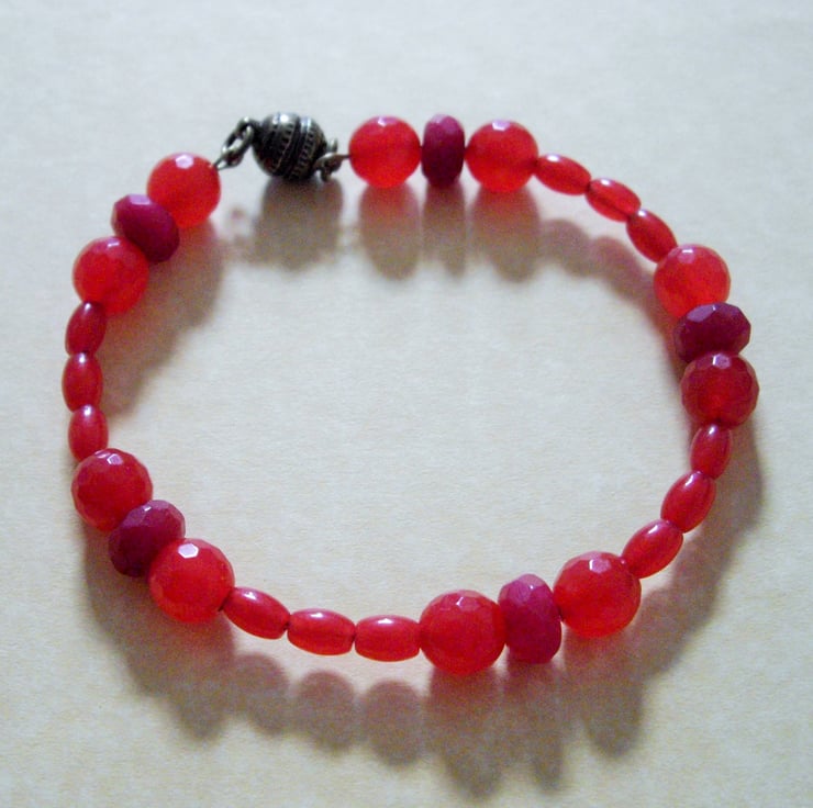 This lovely bracelet is made from red topaz gemstone beads strung on memory wire with a bronze tone magnetic catch.